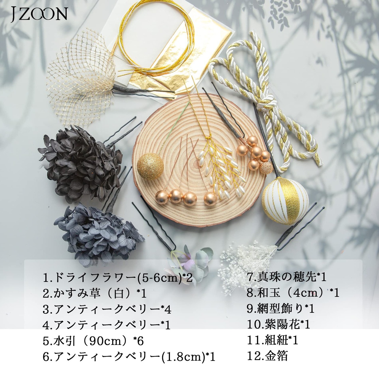 【上品なアイテム】アジサイとロープリボン、和玉の髪飾り、網型飾り、水引きや造花のお花、ゴルードのアンティークベリーとと金箔も入っているので高級感が溢れ出してきます。