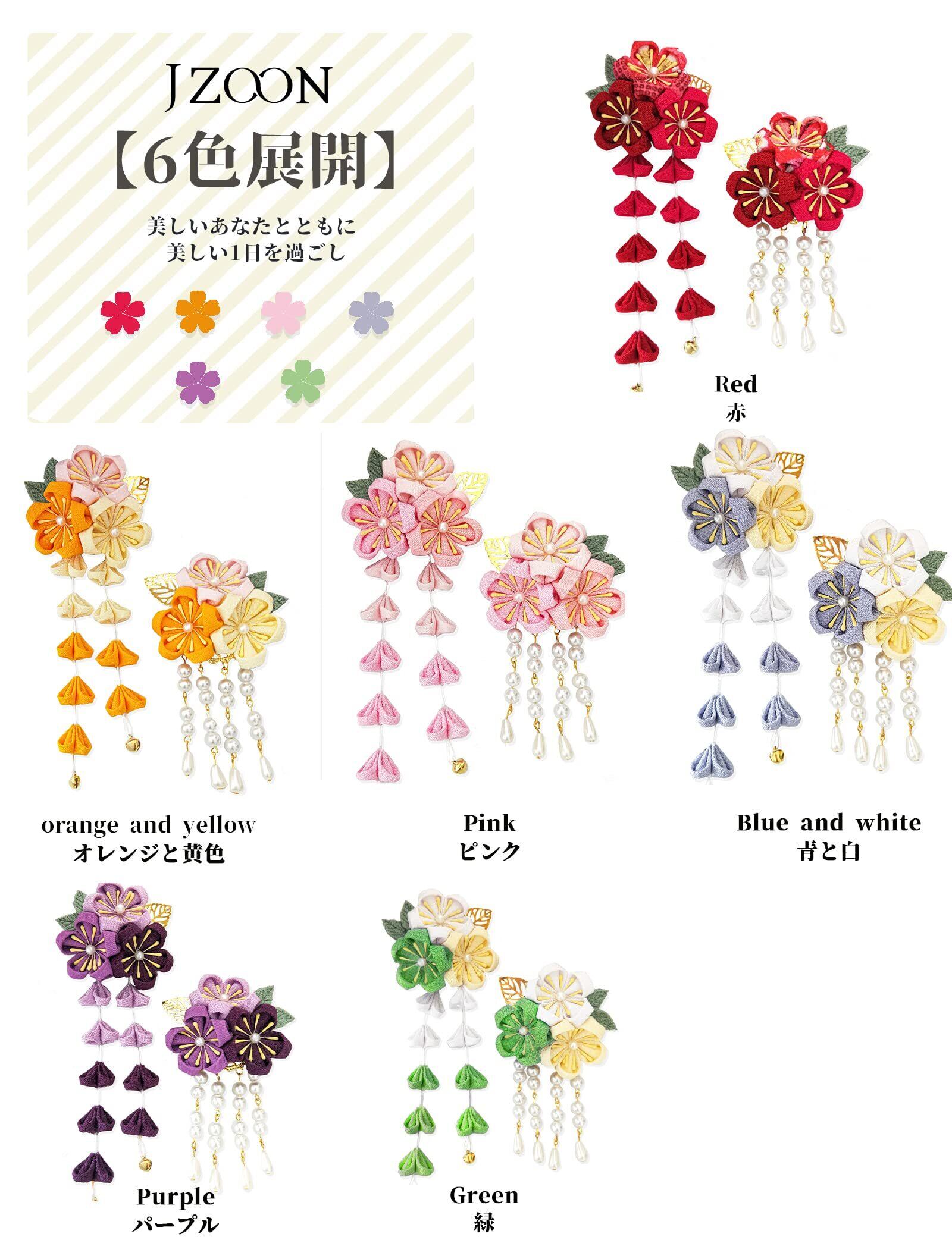 [JZOON] 髪飾り2点セット 成人式 七五三 浴衣 袴 着物 振袖 和装 つまみ細工 花 卒業式 結婚式 鈴付き 手作り 赤 黄 紫 ピンク グレー 白と青 6色