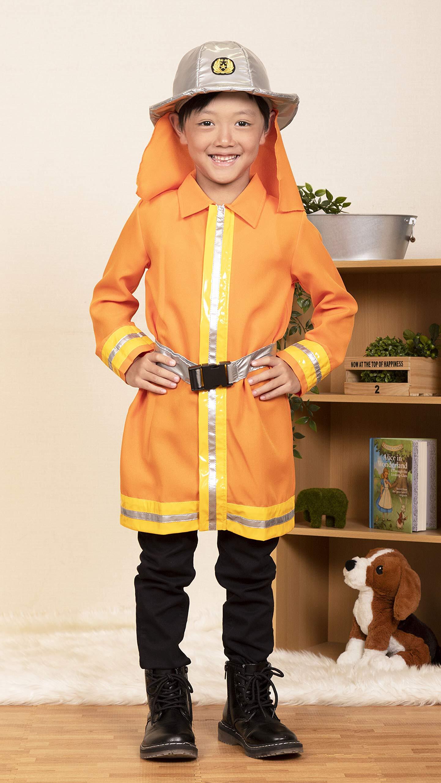メタリックな帽子とベルトが雰囲気を出してます。オレンジのジャケットで、勇敢でかっこいい消防士に変身。