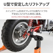リアスタンドのL型フックを使用の際に不安定になりがちな、スイングアーム形状がプレスタイプや丸楕円パイプの車両に最適です。