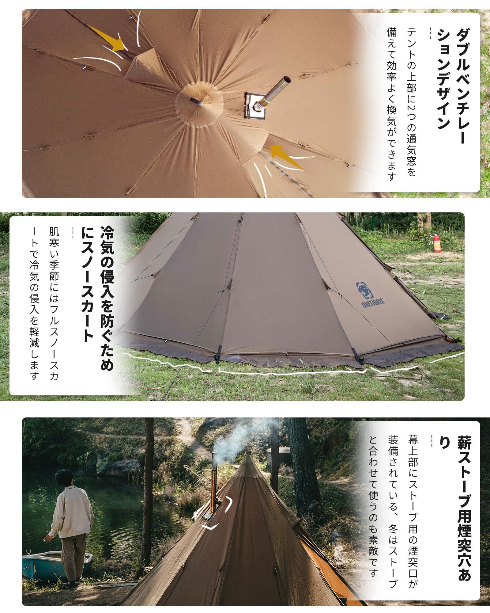 OneTigris Rock Fortressホットテント 2-6人用ワンポールテント 1本ポール付き ベンチレーション機能 耐水圧3000mm 大型サイズテント ティピーテント ツーリング アウトドア キャンプ コンパクト 通気 キャンプ用 | Bloomia