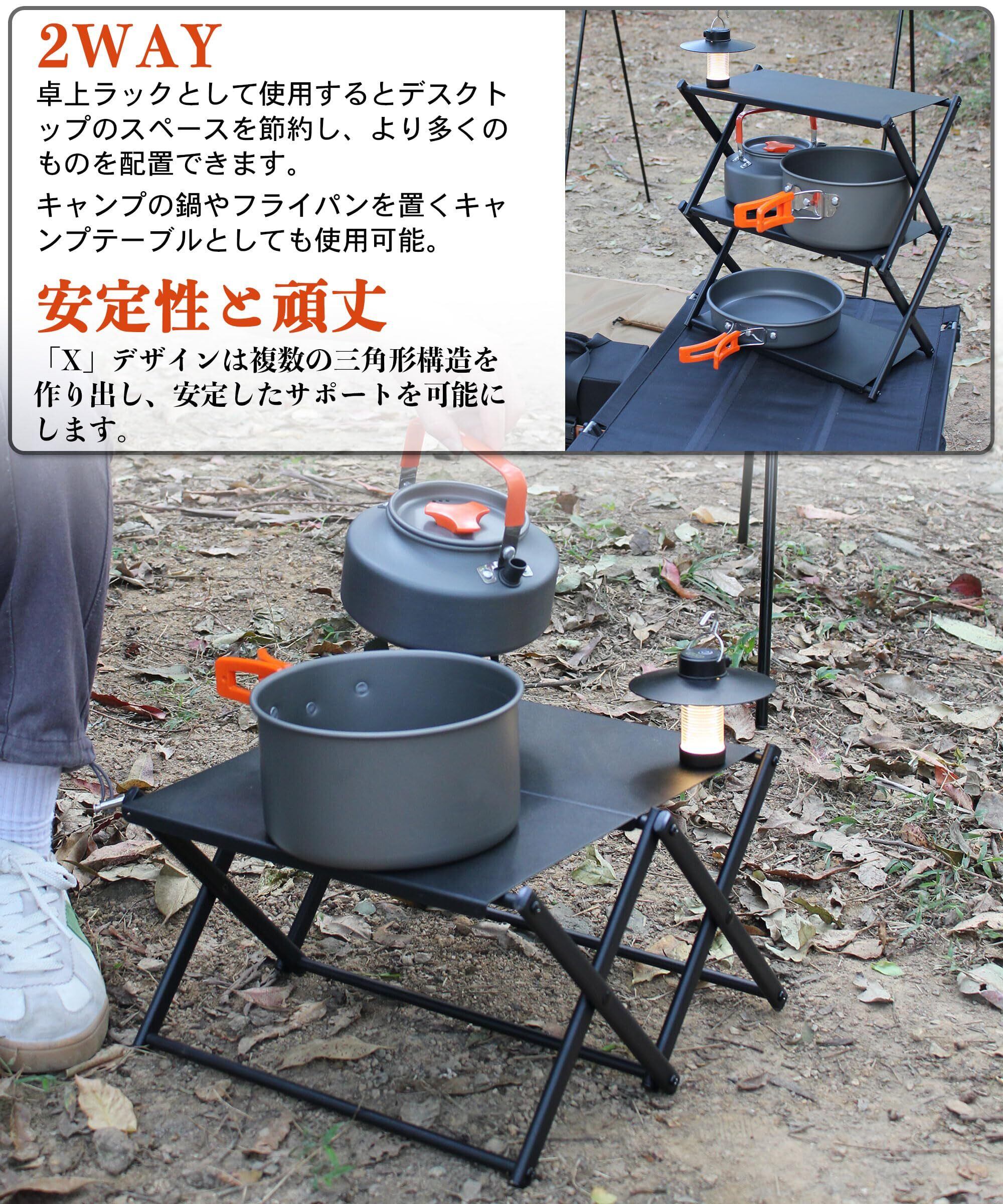 【2way】キャンプテーブルとしてもキャンプ棚としても使用可能。横に使えばアウトドア ローテーブル、縦に使えば二段キャンプ棚になります。使用シナリオやニーズに応じて、キャンプ用調理器具や小型バーナーを置くテーブルとして設置したり、調味料を置くキャンプ卓上ラックとしても使用できます。