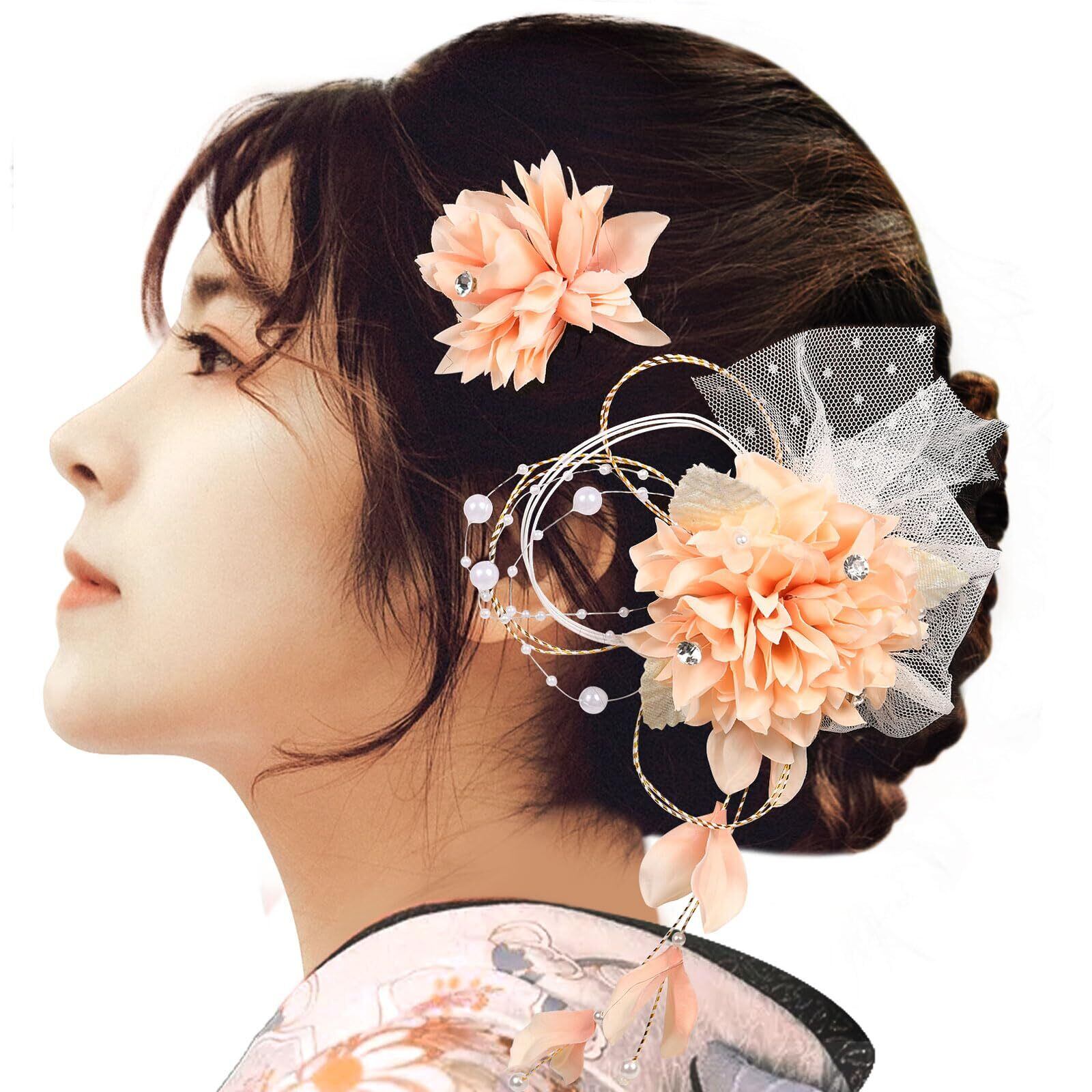 [OTAKUMARKET] 髪飾り 卒業式 袴 成人式 浴衣 2点セット 振袖 花 着物 髪 飾り 和装 七五三 結婚式 髪 飾り 髪留め コーム ヘアアクセサリー 3カラー (オレンジ) | Bloomia