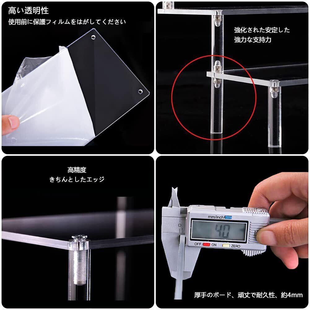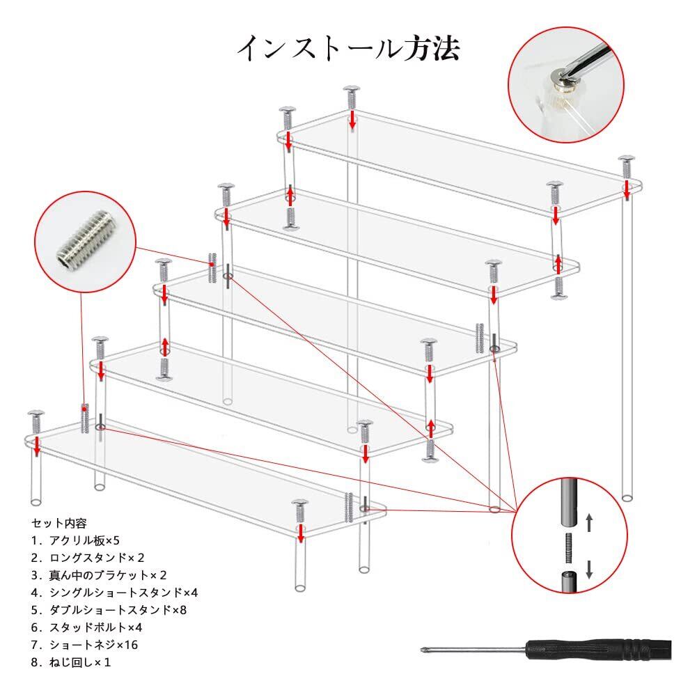【組立】-展示台は5枚の透明板、16本の支柱と20個の取付ネジから構成され、取付ネジを板面を通して支柱と接続し、ミニドライバで締め付けるだけでよく、安定して転倒しにくく、展示板の両面に保護膜が貼られているので、はがしてから組み立ててください。そうしないと透明度に影響します。