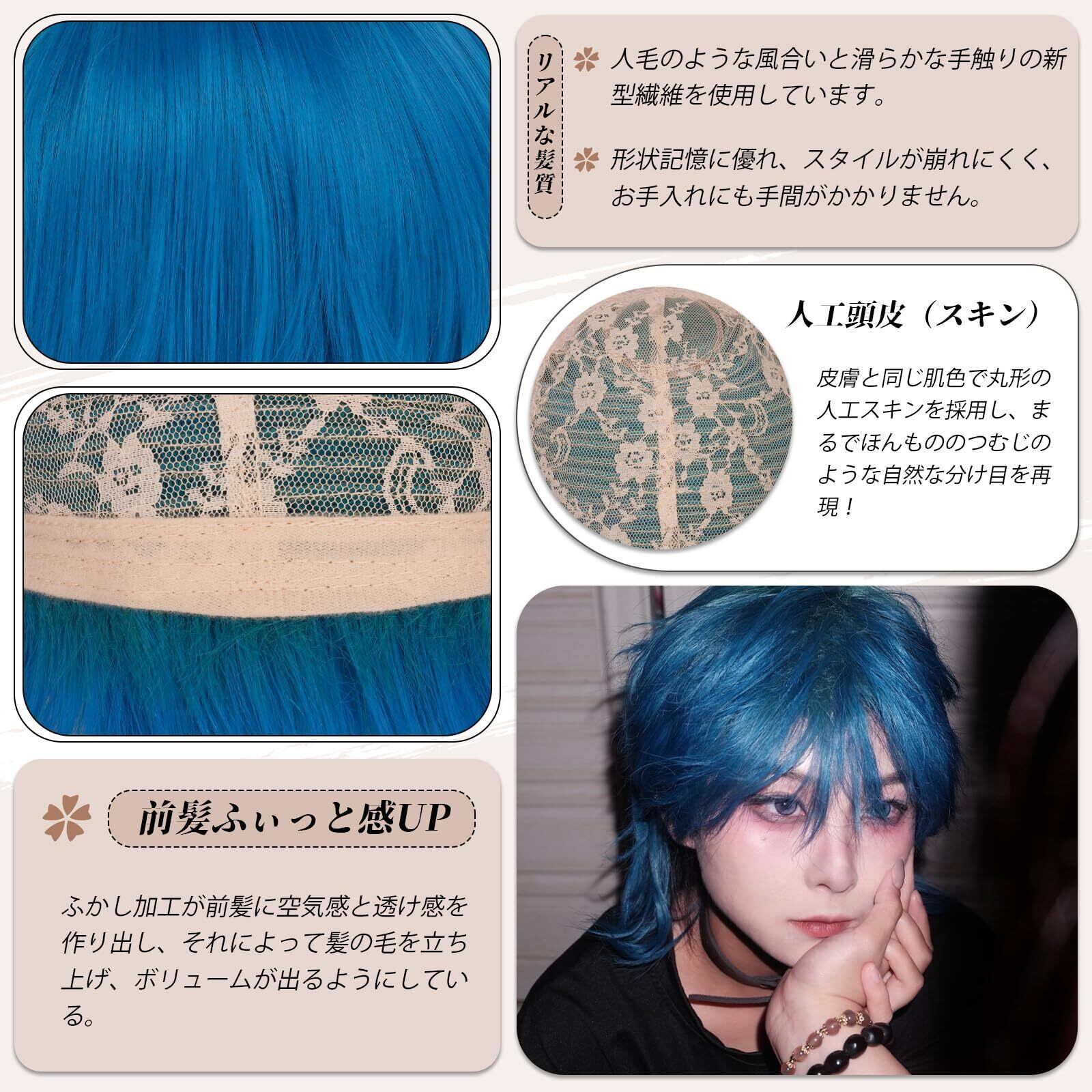 FESHFEN ウィッグ かつら メンズ ウルフ 黒髪 男性 フルウィッグ ウルフカット 男装 黒 ショート ハンサム 普段使い ゆるふわ ファッション イケメン 原宿 自然 男女兼用 耐熱 人気 ファッション ふわふわ 短髪 ネット/櫛付き ブルー