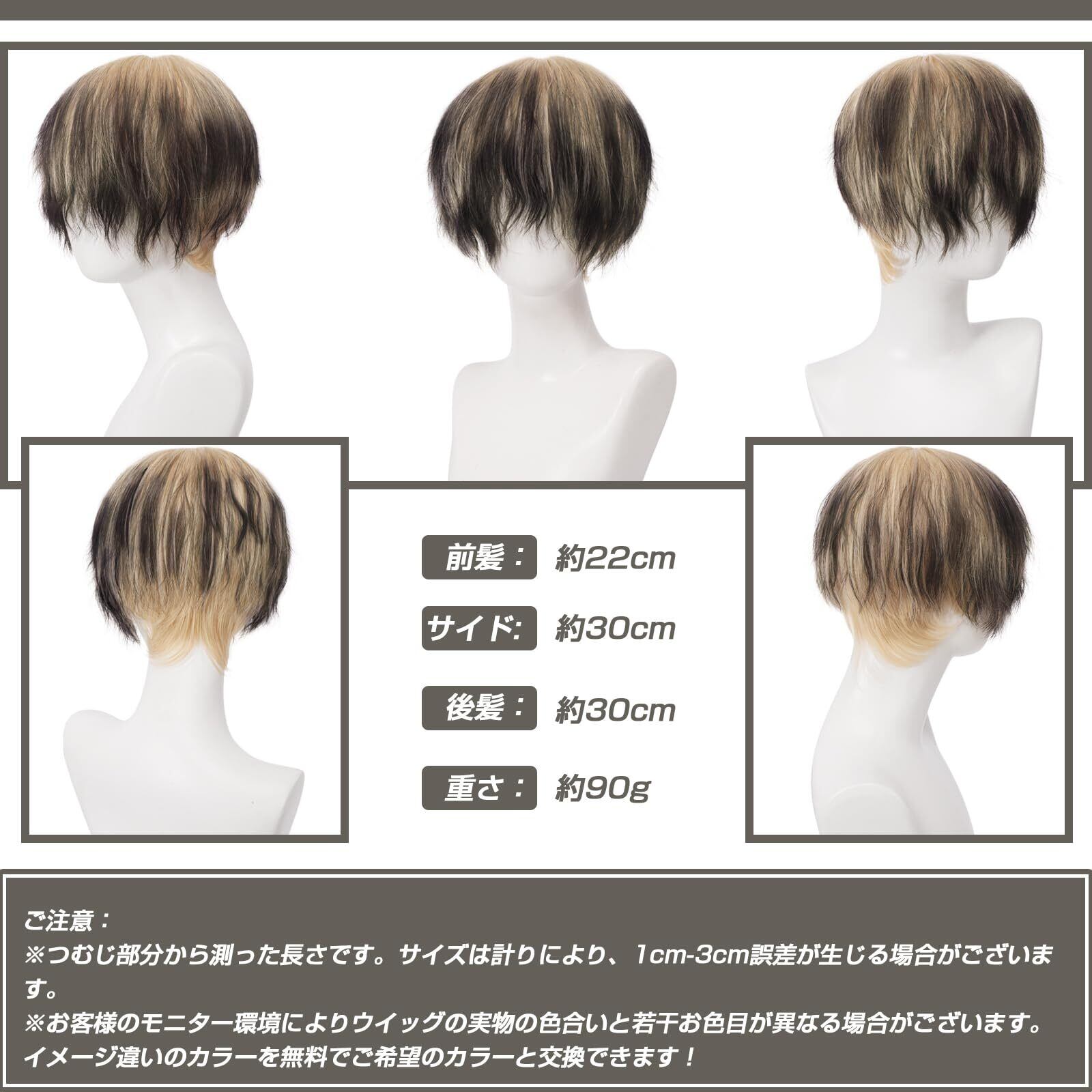 ❀商品情報:前髪:つむじから約22cm 後髪:つむじから約30cm 重さ:約90g。※(つむじ部分から測った長さです。サイズは計りにより、1cm-3cm誤差が生じる場合がございます。)アジャスター付きなので、個々の頭の大きさに合わせて段階調節することができます。※(ウィッグは後頭部の内側にサイズを調整できるアジャスターが着いています。頭周り53〜58㎝に調整することも可能です。)※(モデル画像は形を整えています、弊店が販売しているウィッグのサイズは長いので、取り付ける際、自分に似合うように長さを切ることもできます。)
