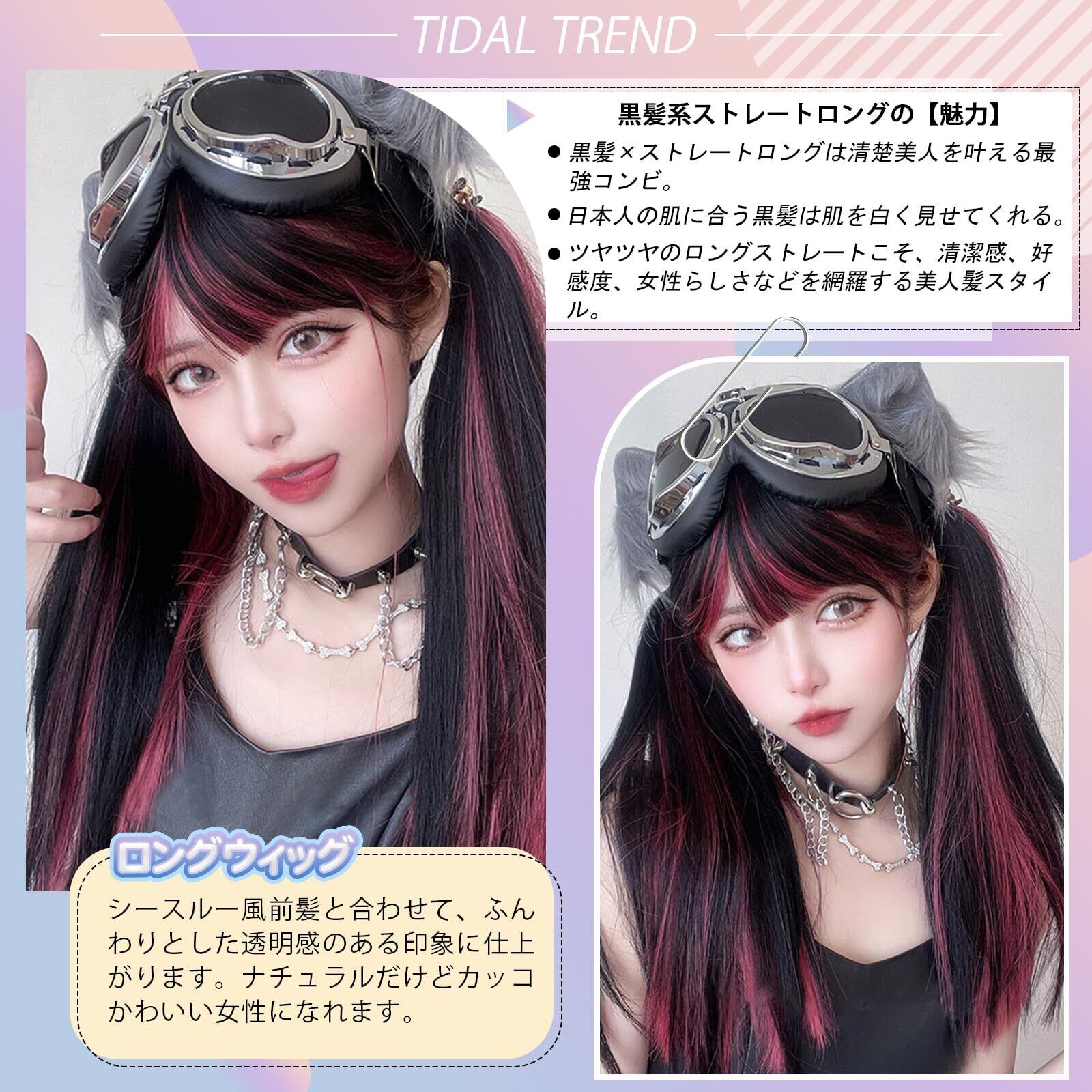 FESHFEN ウィッグ ロング ストレート インナーカラー かつら 自然 ウィッグ 黒髪 女装 フルウィッグ カツラ ロングウィッグ レディーズ カツラ wig ウイッグ 小顔 ロングヘア ぱっつん前髪 韓国風 耐熱 小顔 人気 黒 ネット/櫛付き ブラック&ザクロレッド