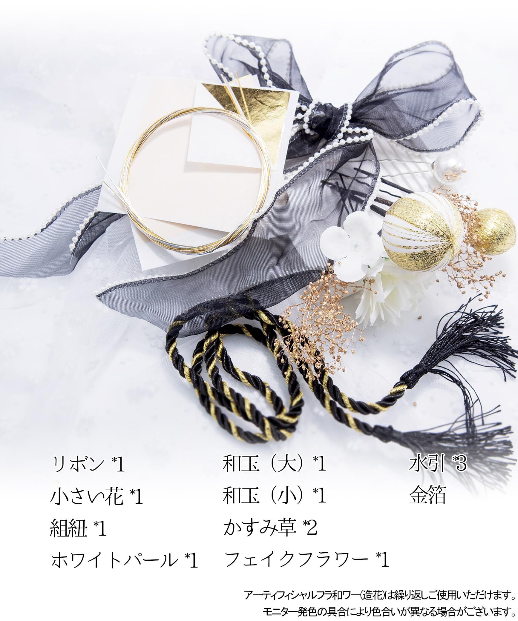 【優雅なデザイン】リボン、小さい花、組紐、ホワイトパール、和玉、かすみ草、ダリア、金箔、水引を華やかにする髪飾り11点セット。