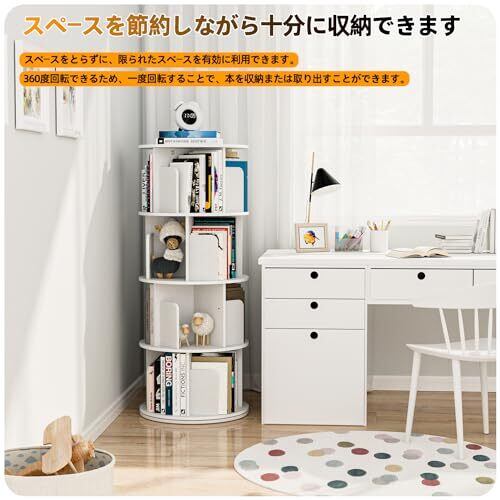 【大容量】この回転式本棚の各棚は4つのコンパートメントに分かれており、少なくとも80〜100冊の通常サイズの本を収納するのに十分なスペースを確保できます。さらに、最上段には、お子様のおもちゃ、アルバム、また他の日常必需品を置くための追加スペースがあります。