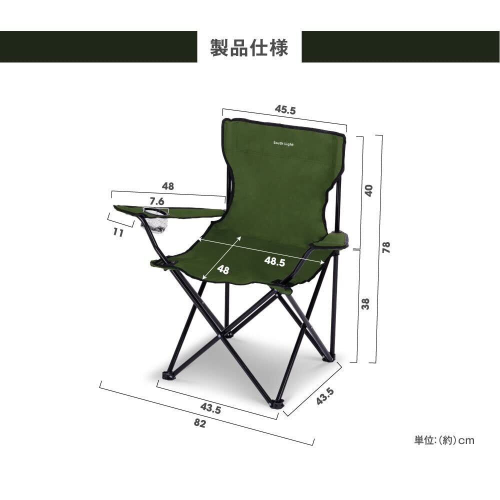 【仕様】 製品名:アウトドアチェア 材質:スチール(フレーム)、ポリエステル(座布) サイズ:組立時 約W82xD48xH78cm 収納時 約W81xD15xH15cm カラー:グリーン 重量:約1.7kg(1個あたり) 耐荷重:約100kg(1個あたり) 同梱品:本体×1、収納バッグ(ポリエステル製)×1