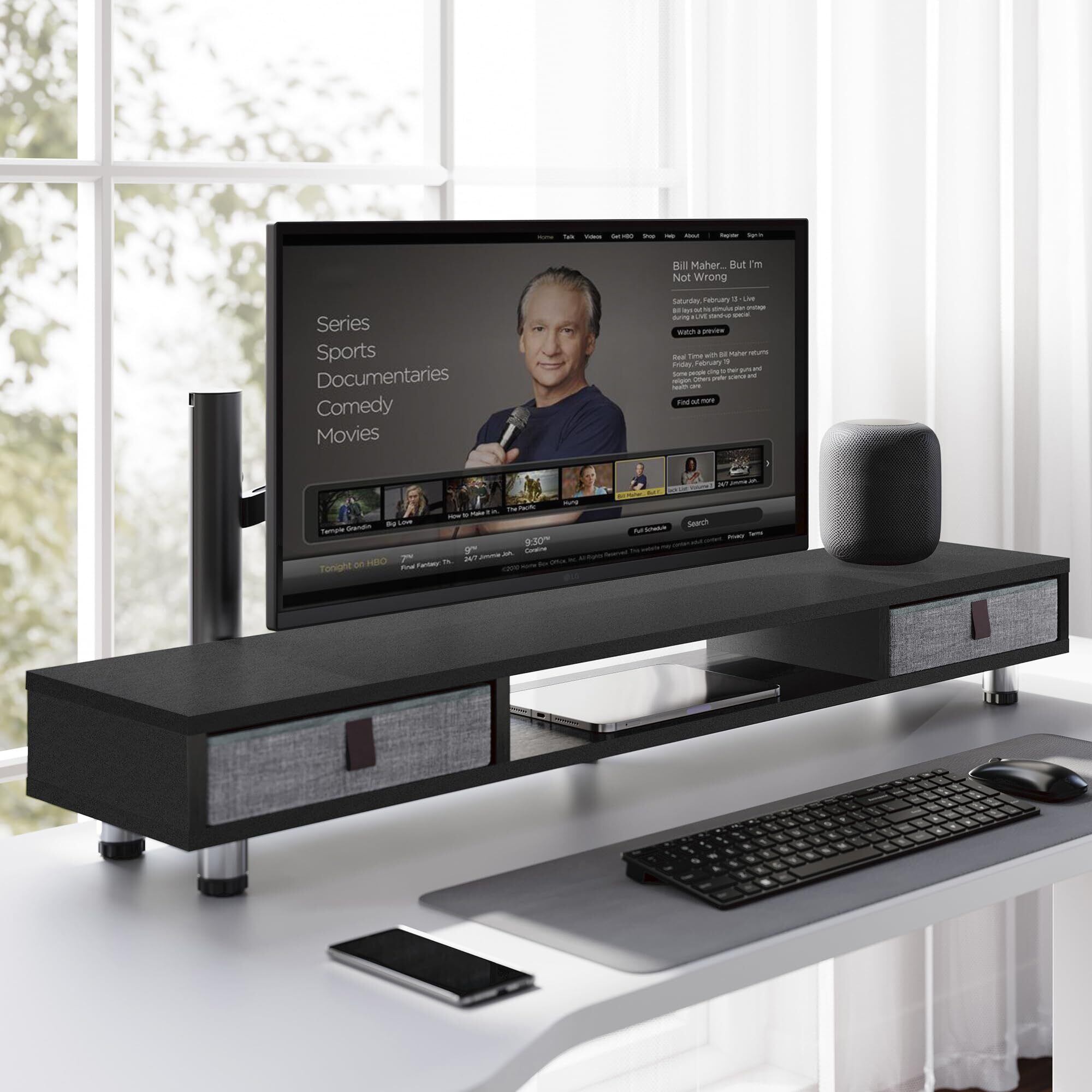 【収納プラス・デスク上をすっきり】モニター台2段式で上段は二つの引き出しが付いているので、ペン、スマホ、ノートなどの文具小物一気に収納できます。 下段の空間を活用して、キーボード、マウスなどの周辺機器を整理し、デスクを広くご利用いただけます。