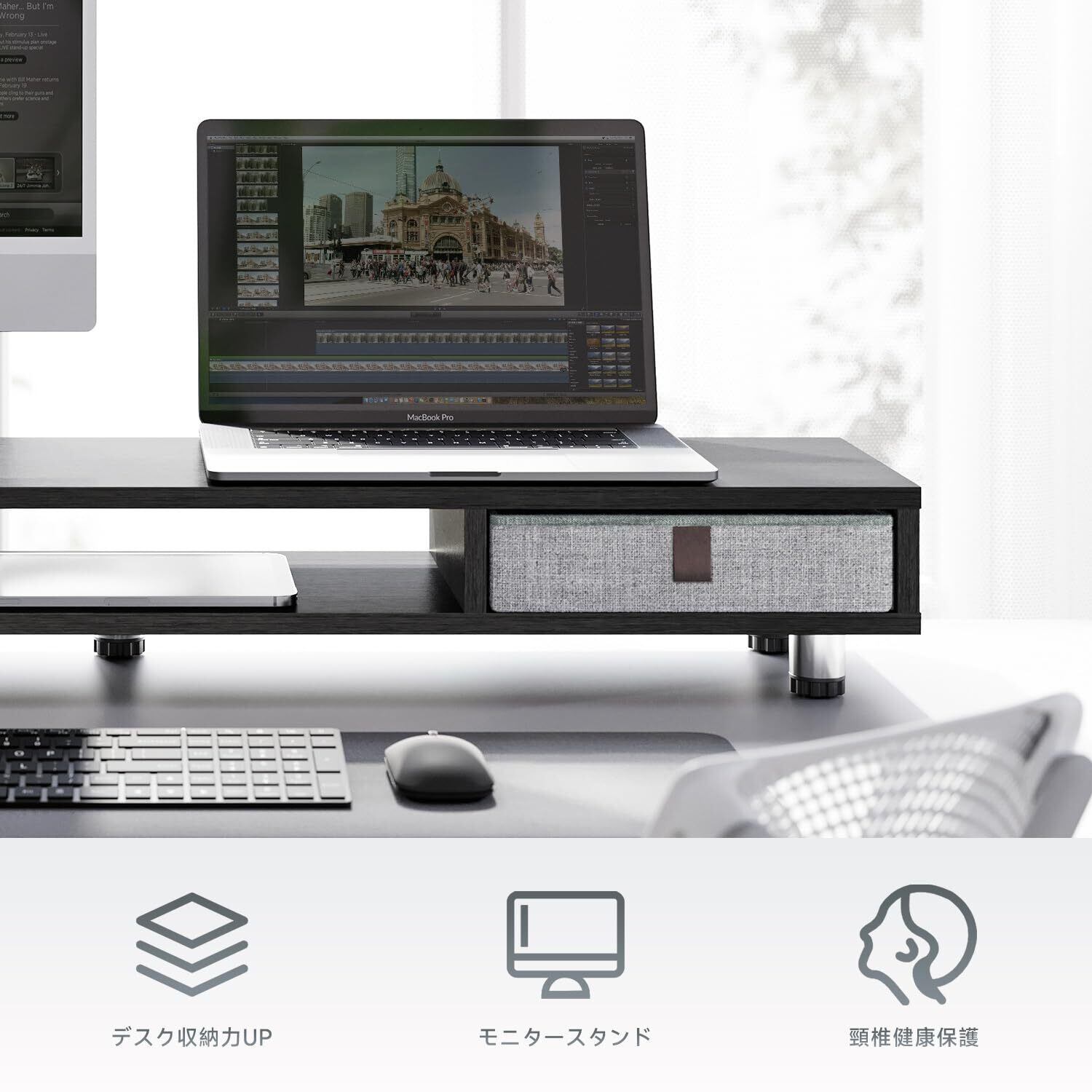 【人体工学設計&猫背対策・作業率アップ】デスクの上置棚にモニターを載せることで目線が15.2-16.7cm高くなり、自然と首や背筋が伸びるようになります。 正しい姿勢を良くキープしながら、健康なワークスタイル変革に!テレワークの作業効率化と整理整頓にも役立つアイテムです。