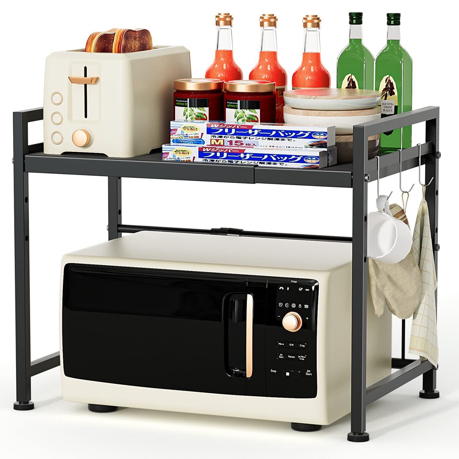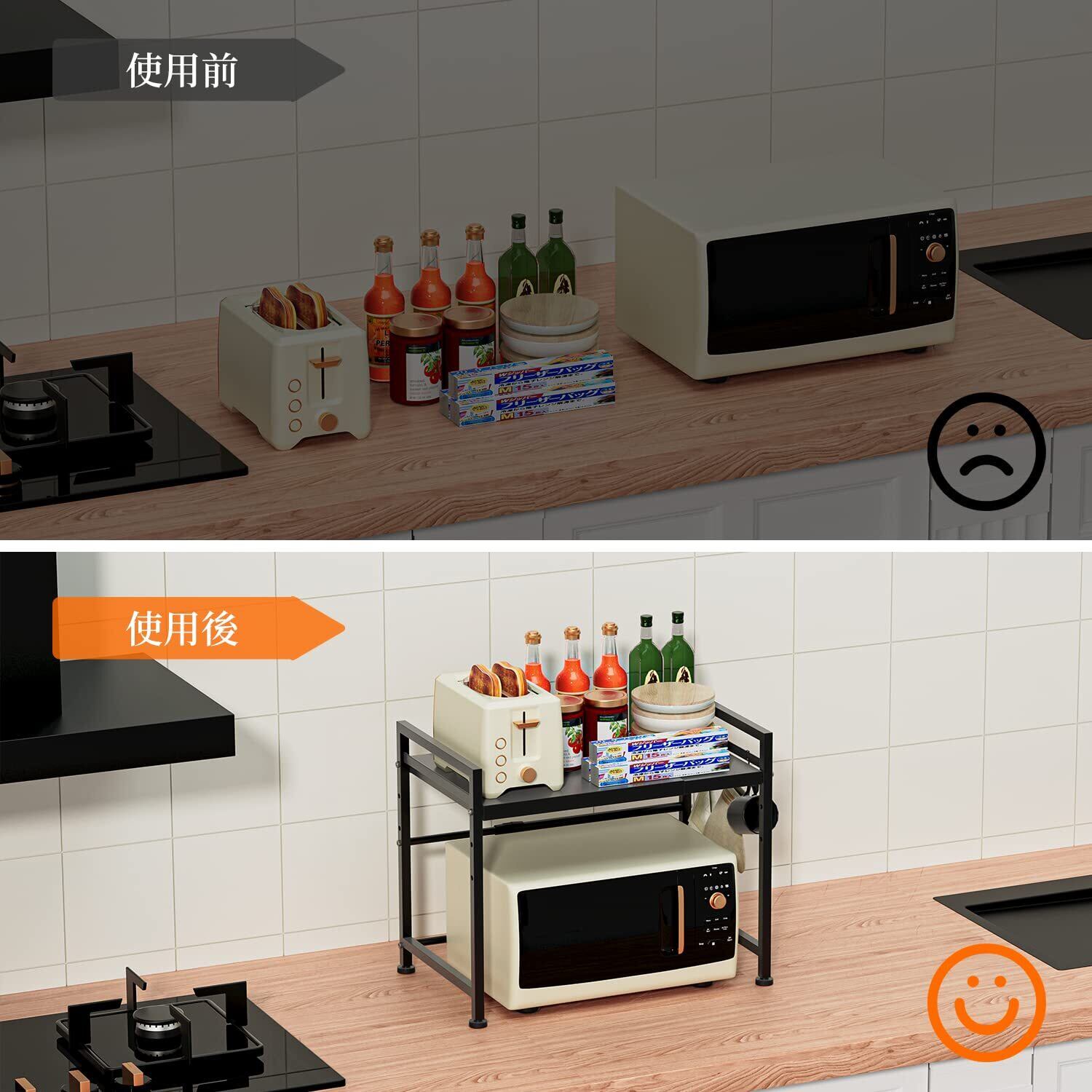 BESONTキッチンラック レンジ台 レンジラック 幅伸縮可(41-60cm)高さ3段調節 三つフック付き (ブラックM)