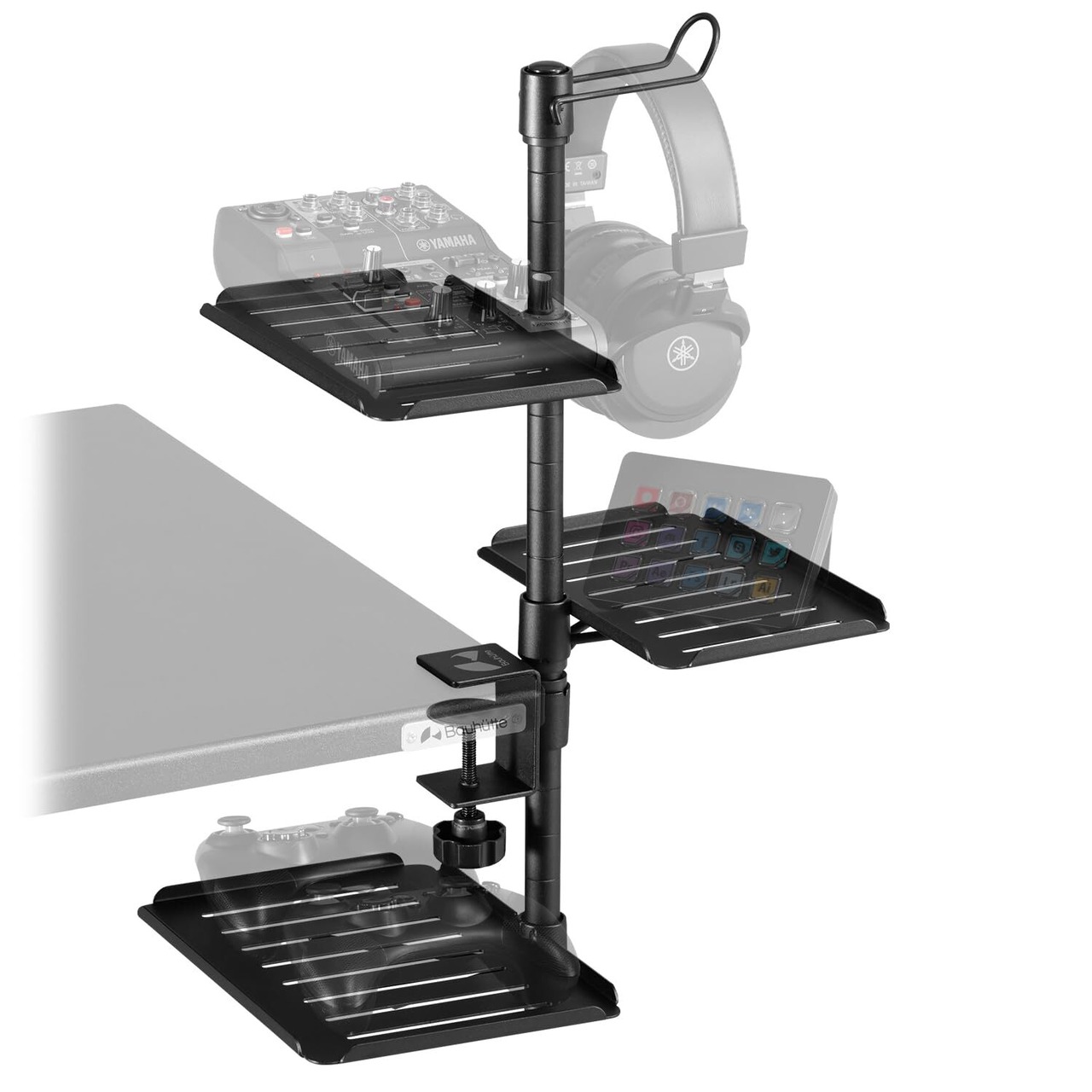【デバイスを浮かせて収納】クランプ固定式の収納スタンドです。オーディオインターフェースなどの周辺機器3つ+ヘッドセット1つを、いつでもサッと手に取れるポジションへと配置可能です。