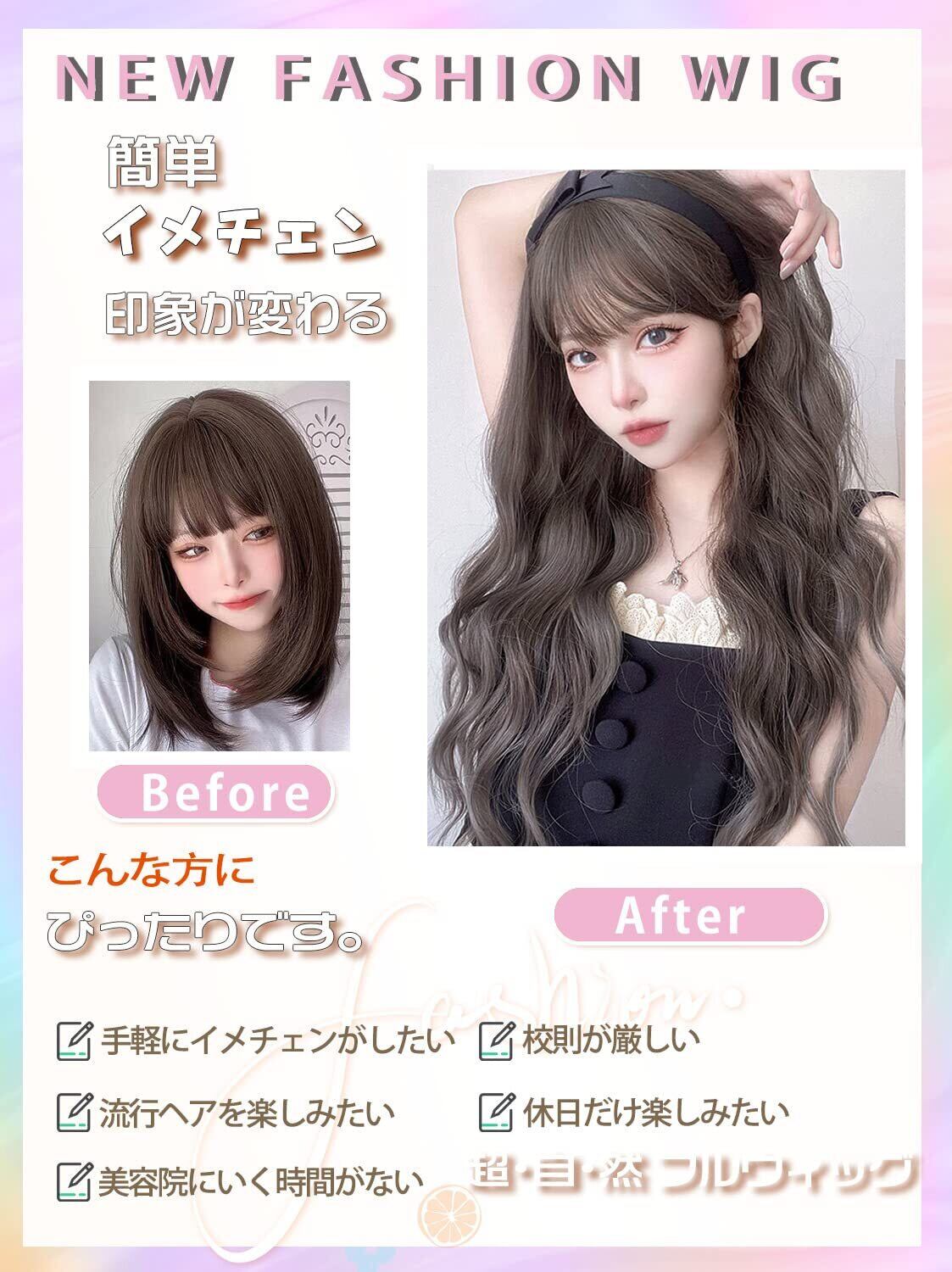 【ウィッグサイズ】:①前髪:つむじから約13CM,後ろ髪:つむじから約55CM。②頭周り:最大約56~58㎝、アジャスター付きなので、個々の頭の大きさに合わせて段階調節することができます。③カラー:ライトブラウン④素材:高品質耐熱ファイバー。⑤同梱内容:ウィッグ/ウィッグネット/日本語使用説明書。