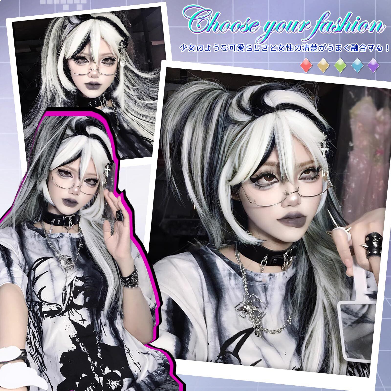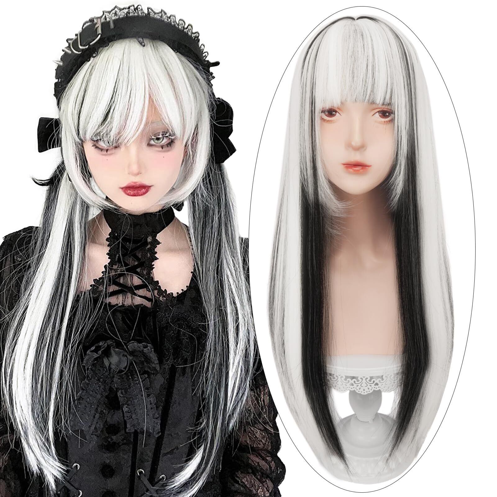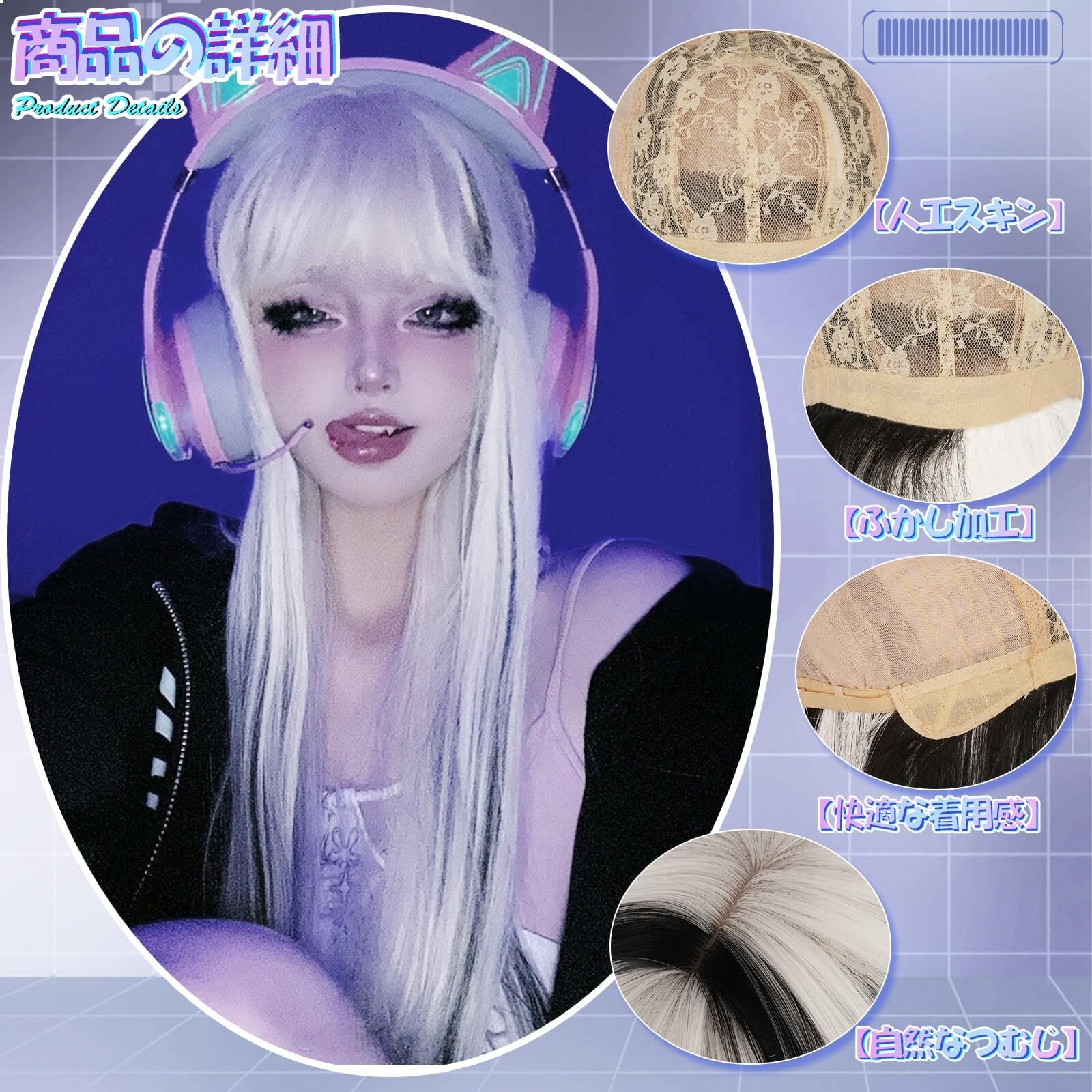 Hawkko ウィッグ ロング ストレート 姫カット フルウィッグ インナーカラー 姫髪 かつら レディーズ 女装 ウィッグ カツラ グラデーション ぱっつん前髪 ロングウィッグ 自然 ぱっつん ロングヘアー 原宿 ロリータ ハロウィーン cosplay 小顔 人気 耐熱 wig 原宿系 ファッション 女装 コスプレ ネット/櫛付き(マットホワイト+ブラック) | Bloomia