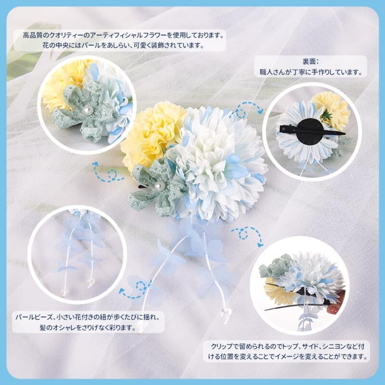 OTAKUMARKET 髪飾り 浴衣 七五三 成人式 髪 飾り 女の子 花 袴 着物 振袖 和装 卒業式 結婚式 髪留め 子供かんざし 和風 高級造花 ヘアアクセサリー3カラー (ブルー) | Bloomia