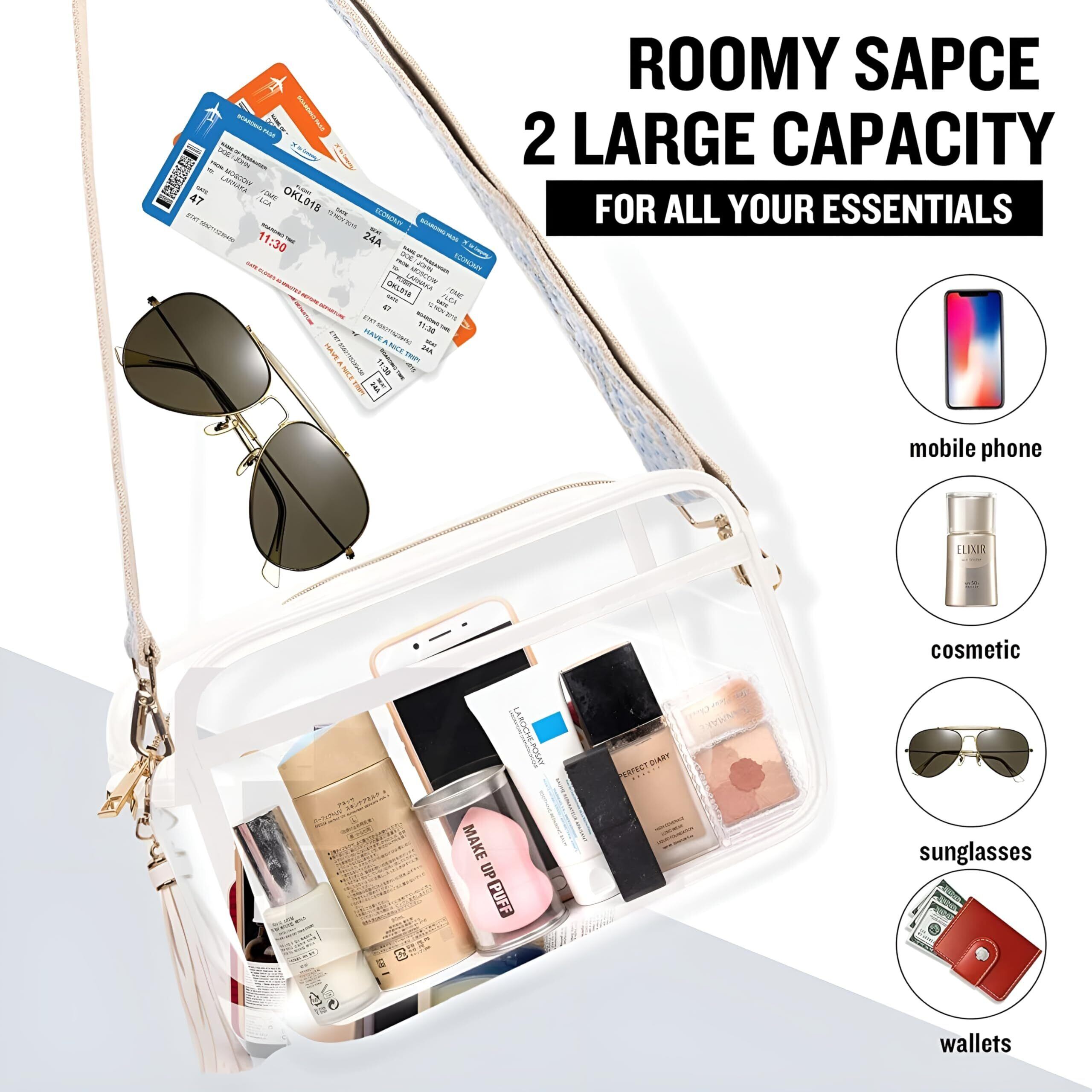 おしゃれ透明デザイン,バッグは一目瞭然な透明仕様で、バッグの中から欲しいものを見つけやすくなります。太い帯には独特の刺繡が施され、美しくおしゃれなアクセントになっています。持ち物の持ち運びに最適です 痛バッグ サイズは大体です26*16*8cm, ジッパー付きの主袋と小物入れ用の副袋があります,お金、カード、鍵、口紅、ガム、ティッシュ、小さな財布、メガネ、メイク、携帯電話などを入れることができます,使いやすいです。すべての重要なものを収納するのに十分なスペースを提供します ワンショルダーにも斜め掛けにも使える2 wayクリアバッグです, 重さ300gです, ショルダーストラップが調節できるので、持ち運びにも便利です. スタジアム承認クリアバッグので、国内外のセキュリティ検査を迅速かつ簡単に通過することもできます。 透明度の高いPVC材質、耐摩耗性、防水性、耐久性があります。雨の日に水に濡れても安心します。プールや海に行くときも活躍します。汚れてもさっと拭くだけ簡単にきれいになります。 多用途で,あらゆる場面で使えます,このバッグはコンサート、スポーツイベントだけでなく、旅行、アウトドア、ビーチ、ショッピング、デート、学校、仕事などにも適しています。