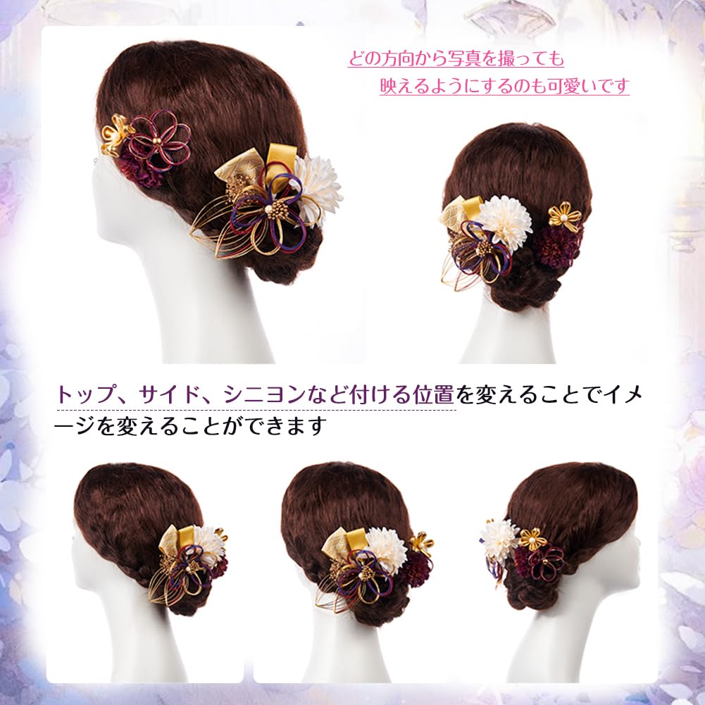 [OTAKUMARKET] 髪飾り 水引 細工 花 袴 成人式 振袖 着物 和装 浴衣 卒業式 七五三 髪 飾り 和風 ヘアアクセサリー 結婚式 コーム 2枚セット (パープル)