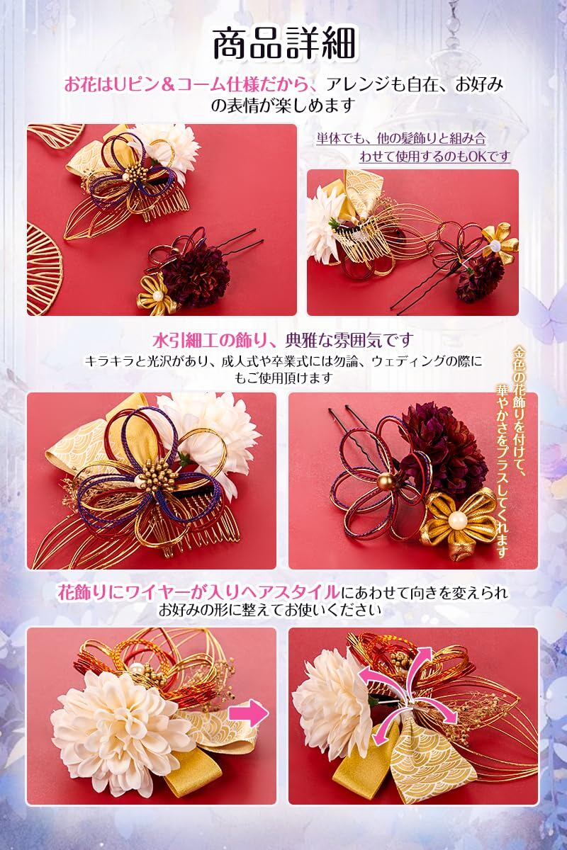 【和装髪飾りセット内容】髪飾2枚セット。髪飾りは簡単に取り付けられやすいです。綺麗に梱包しますので、新年、誕生日、クリスマス、バレンタインデーギフトとしてお勧めます。浴衣や着物などの和服だけでなく、普段使いにも便利なタイプです。