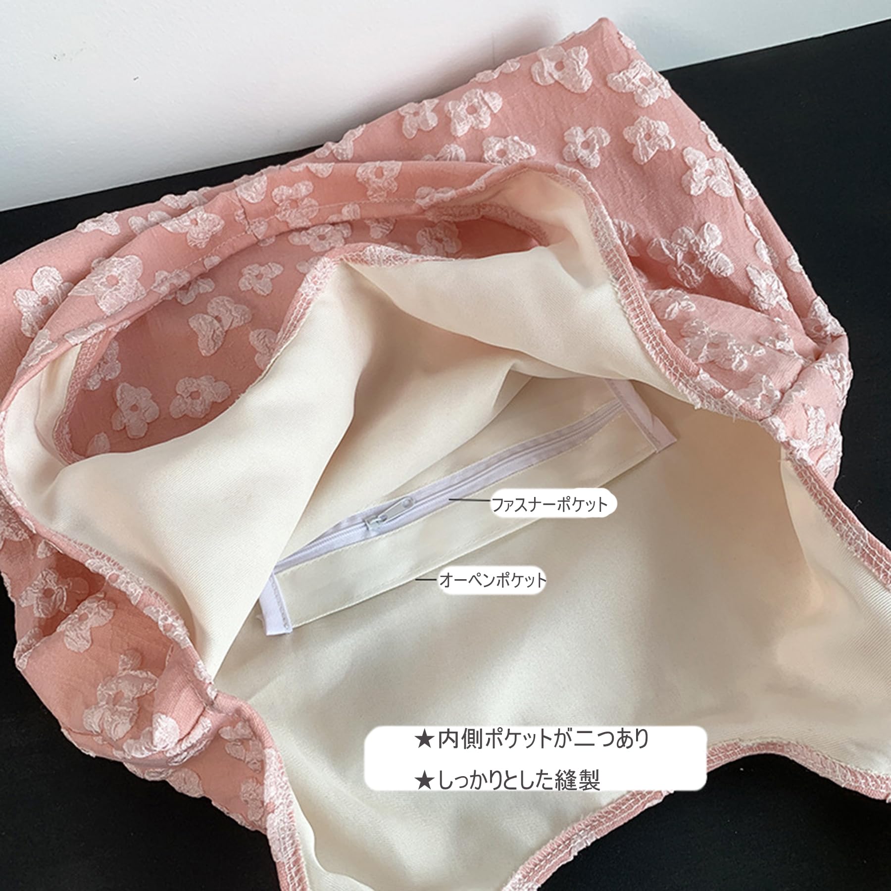 シンプルなデザインに立体の花柄が合わさり、可愛らしく使いやすいです。手持ち/肩掛けの2wayで利用して頂けます。