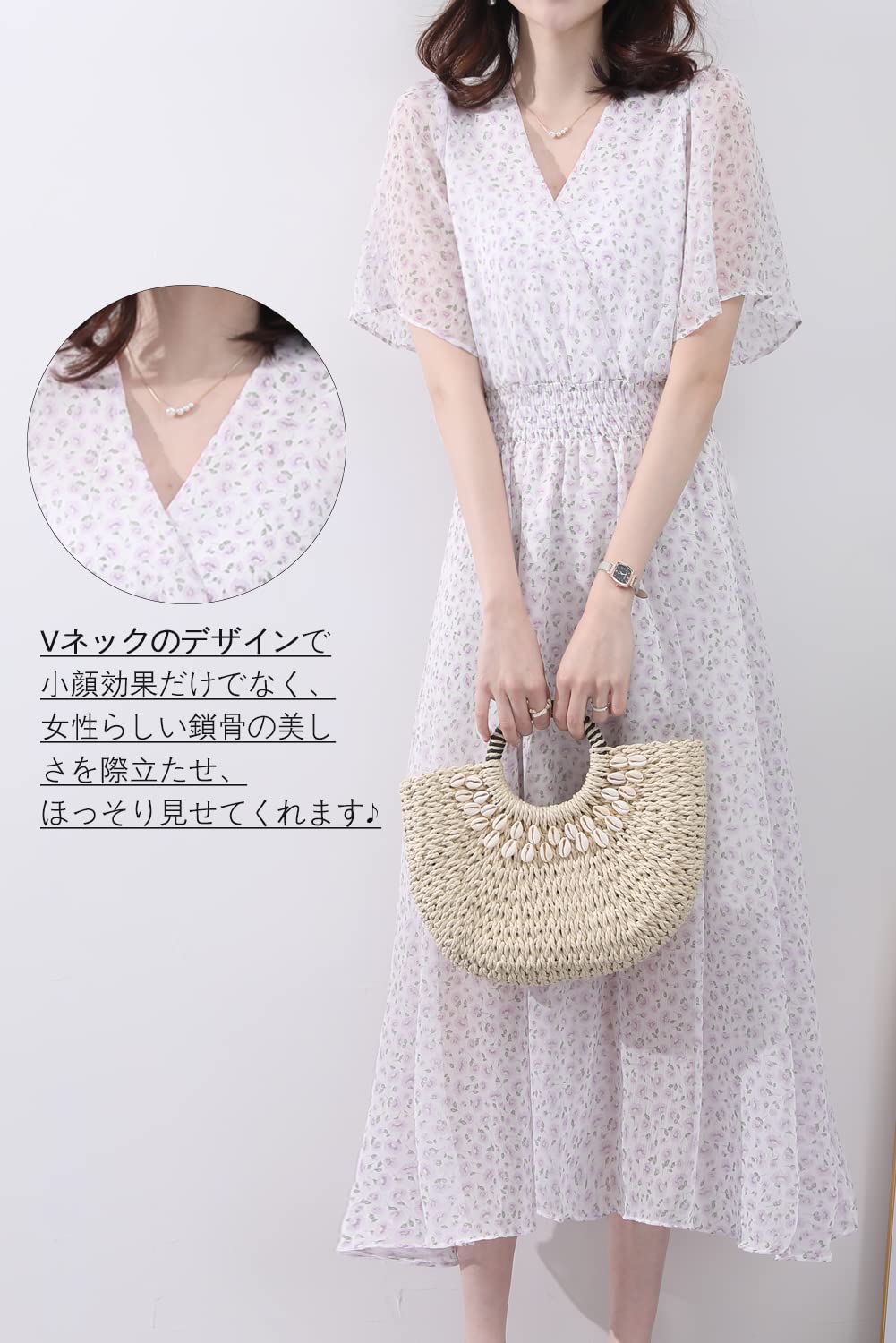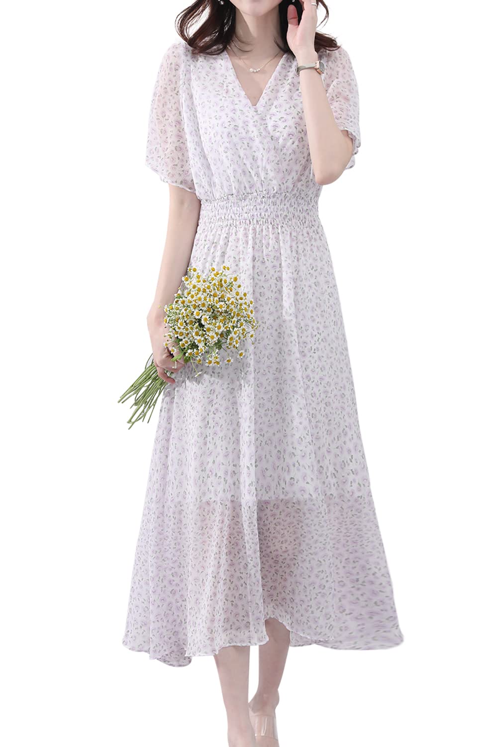 [Yino] 花柄 ロング ワンピース 半袖 レディース シフォン マキシワンピース Vネック フレア袖 裏地付き ウエストゴム 着痩せ おしゃれ 可愛い お呼ばれ お出かけ 通勤 普段着 夏 | Bloomia