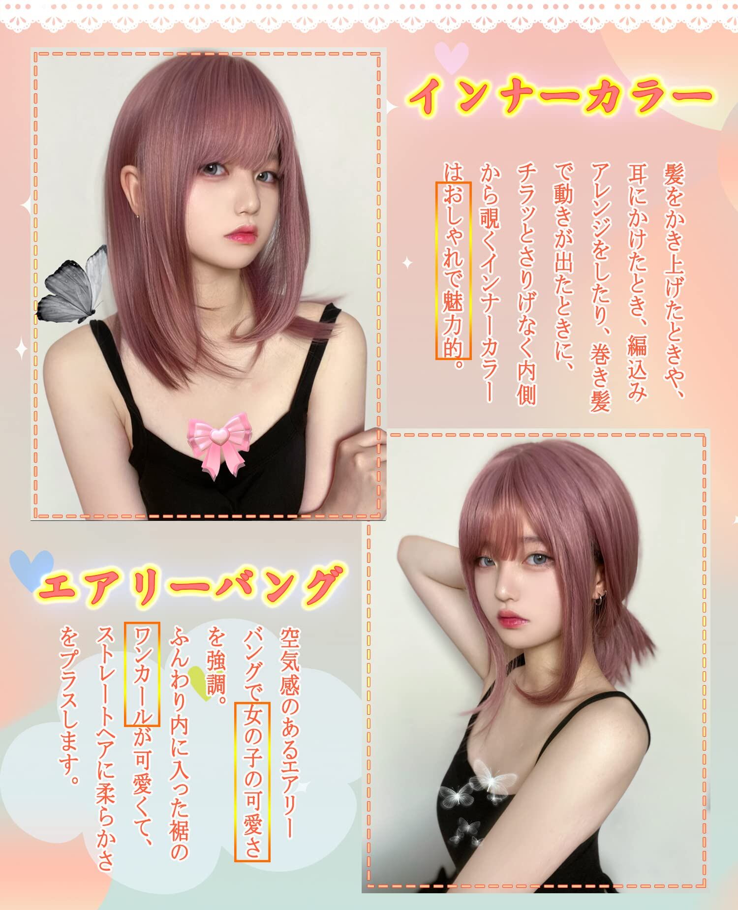 Limakaraウィッグ セミロング ストレート 黒 金髪 インナーカラー グラデーション ロング ミディアム フルウィッグ ロリータ wig コスプレ サラサラ ぱっつん 女性 小顔 自然 ネット付き (モーブピンク) | Bloomia