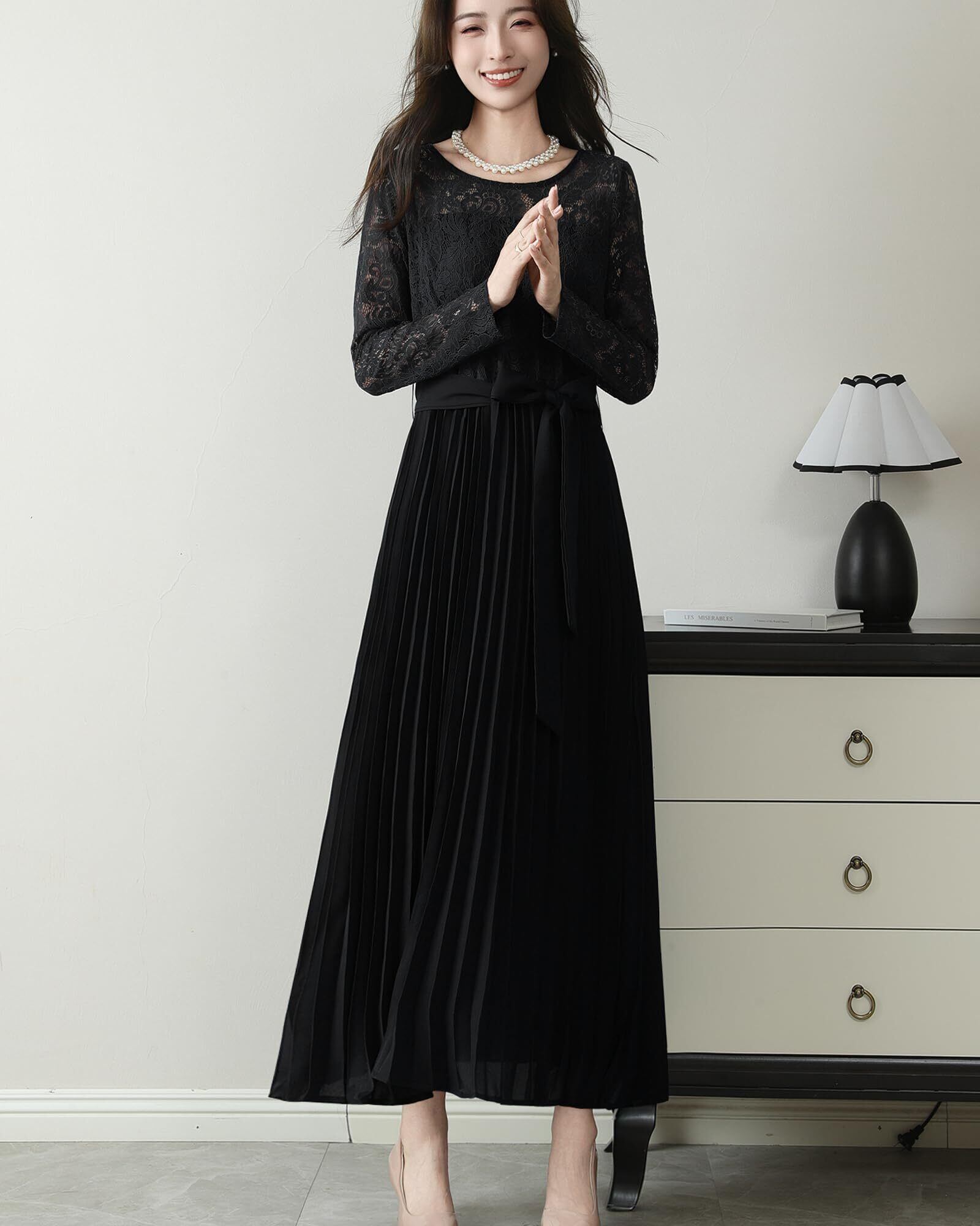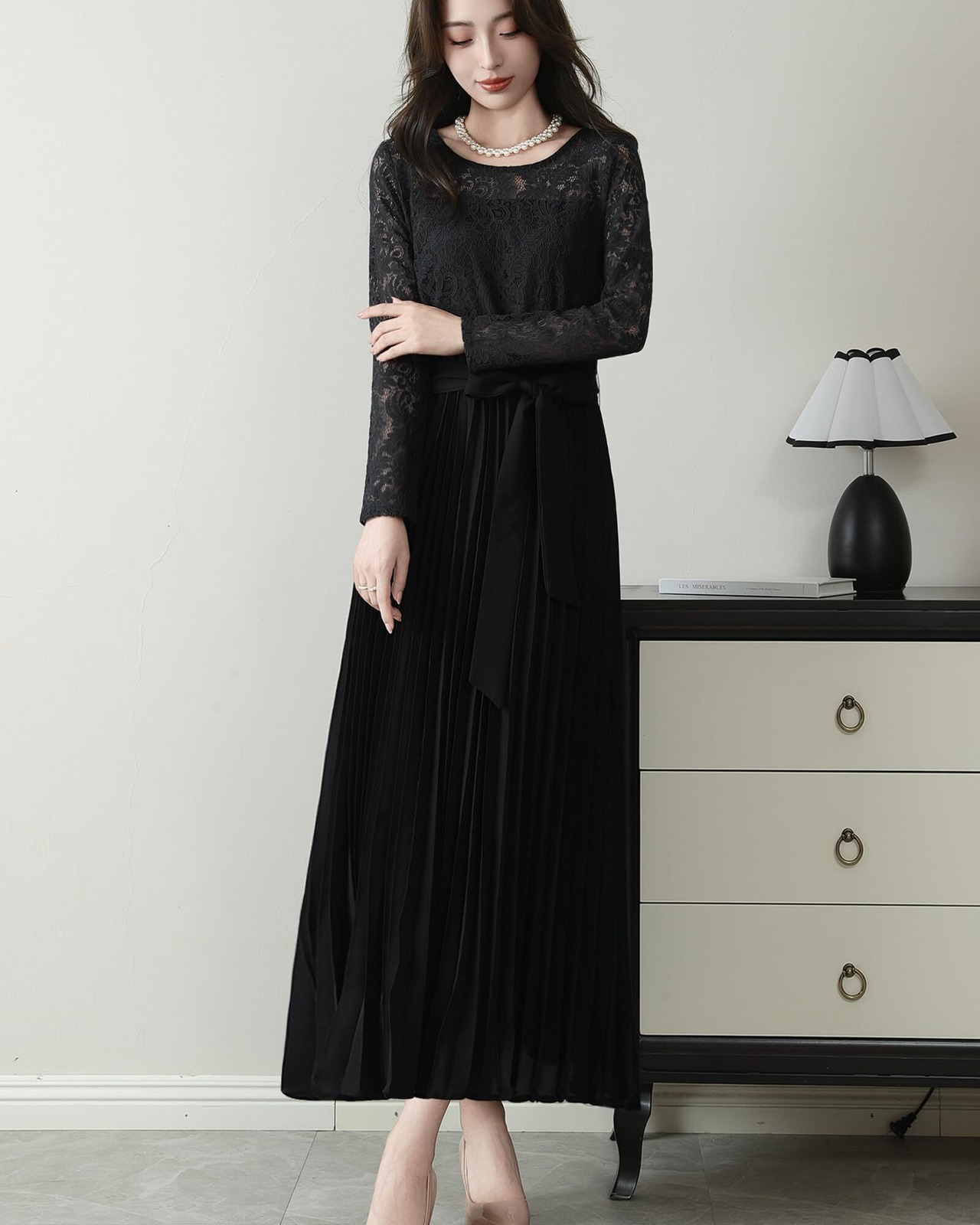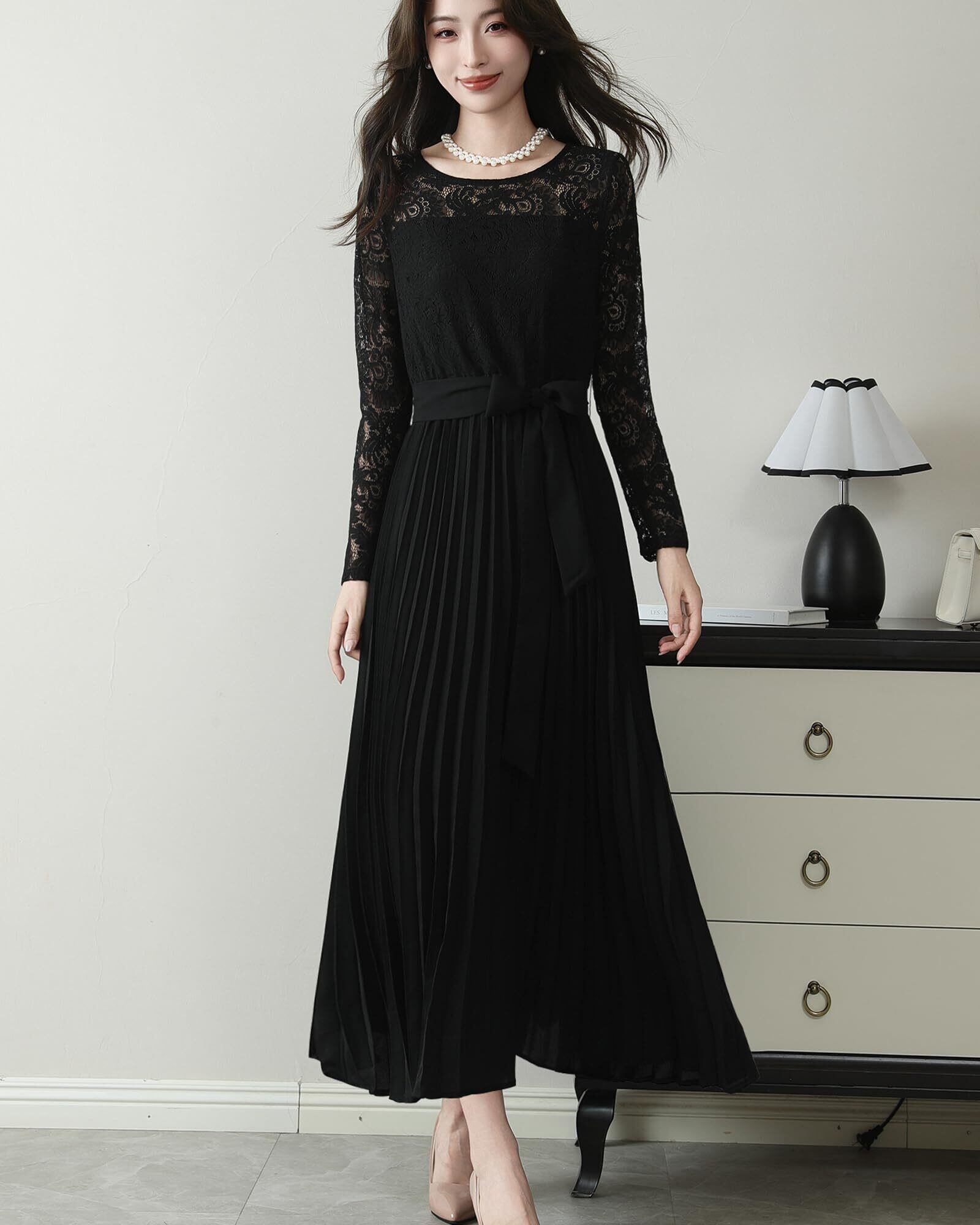 [Yino] パーティードレス ワンピース ドレス レディース レース プリーツ 切り替え 長袖 ベルト 裏地 着痩せ ロング丈 女性らしい 可愛い フォーマル 結婚式 二次会 披露宴 お呼ばれ 秋 春