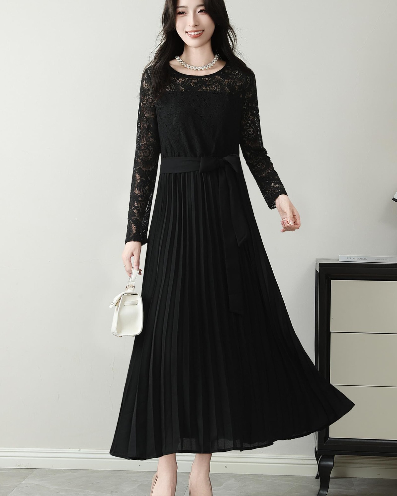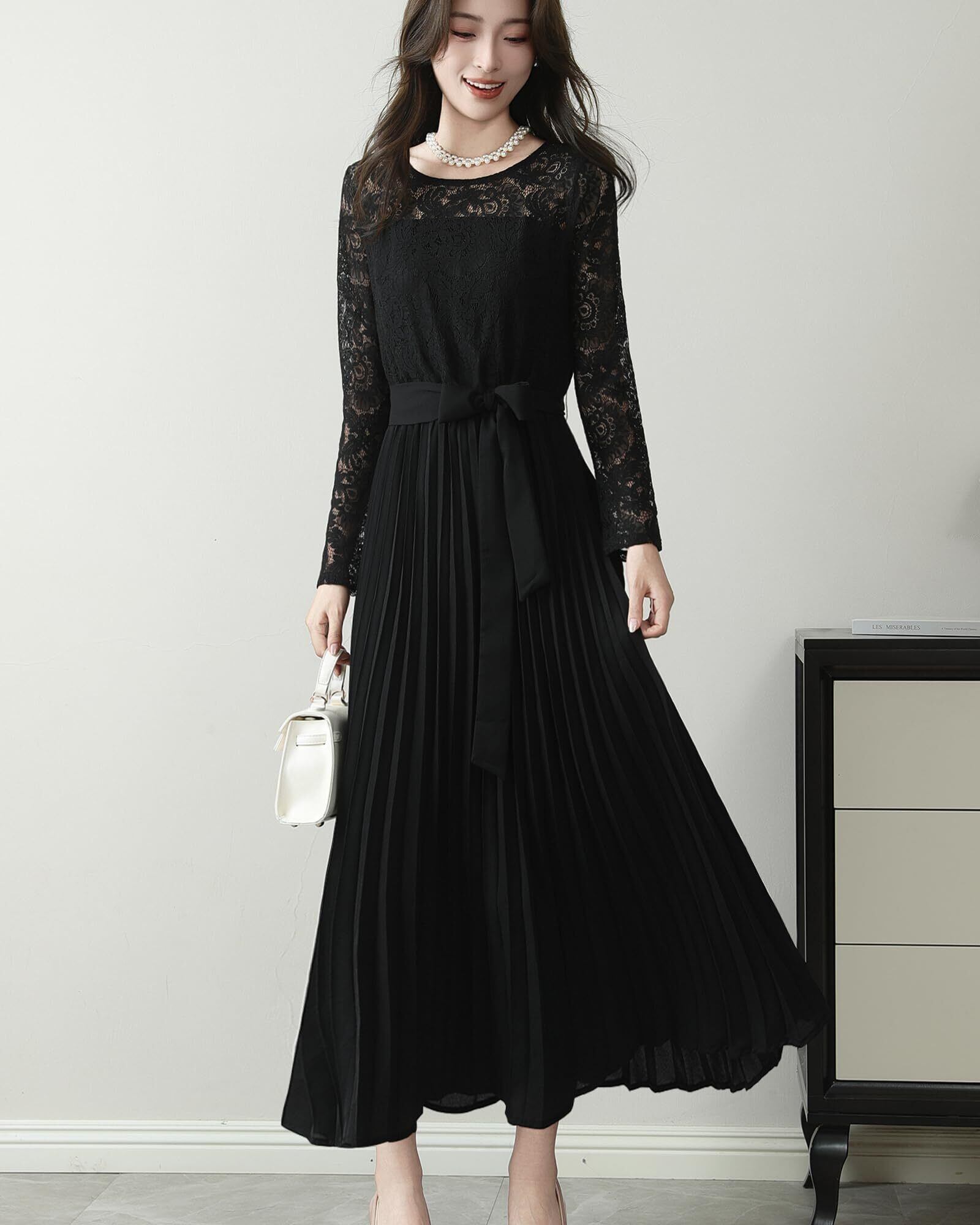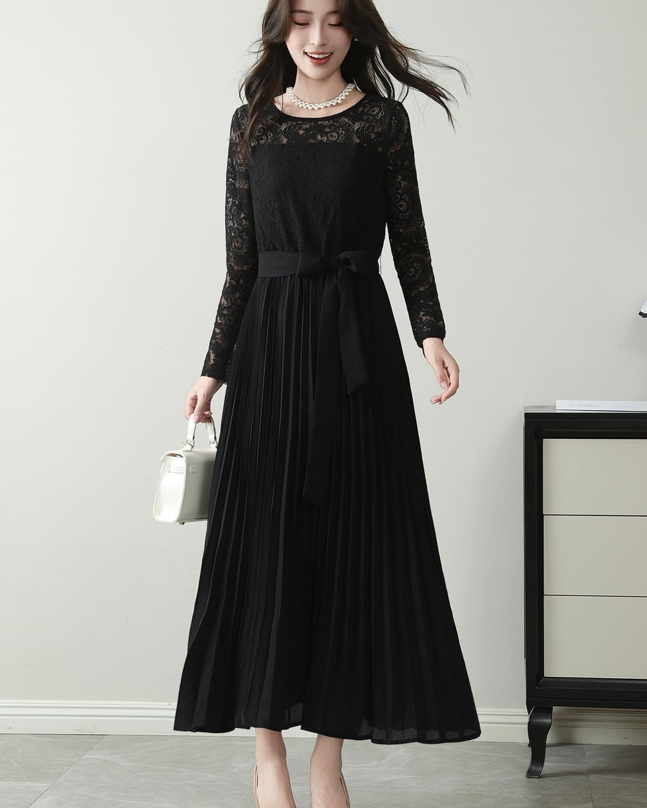 [Yino] パーティードレス ワンピース ドレス レディース レース プリーツ 切り替え 長袖 ベルト 裏地 着痩せ ロング丈 女性らしい 可愛い フォーマル 結婚式 二次会 披露宴 お呼ばれ 秋 春 | Bloomia