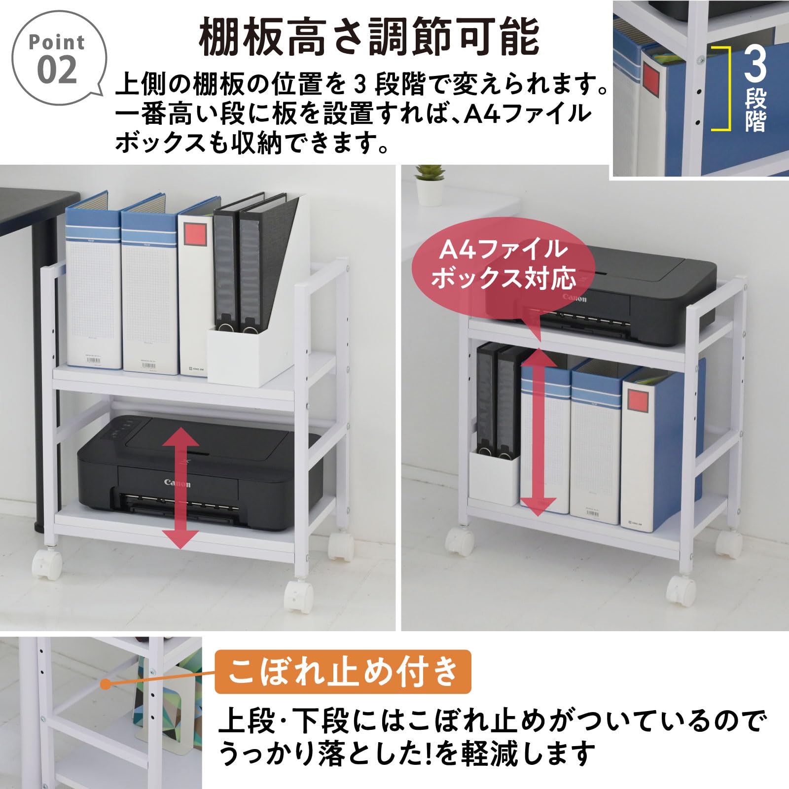 【A4のファイルボックスが収納可能】使用スタイルに合わせて中板の位置を変えられます。一番高い段に板を設置すれば、下段にA4ファイルボックスがぴったり収納できます。