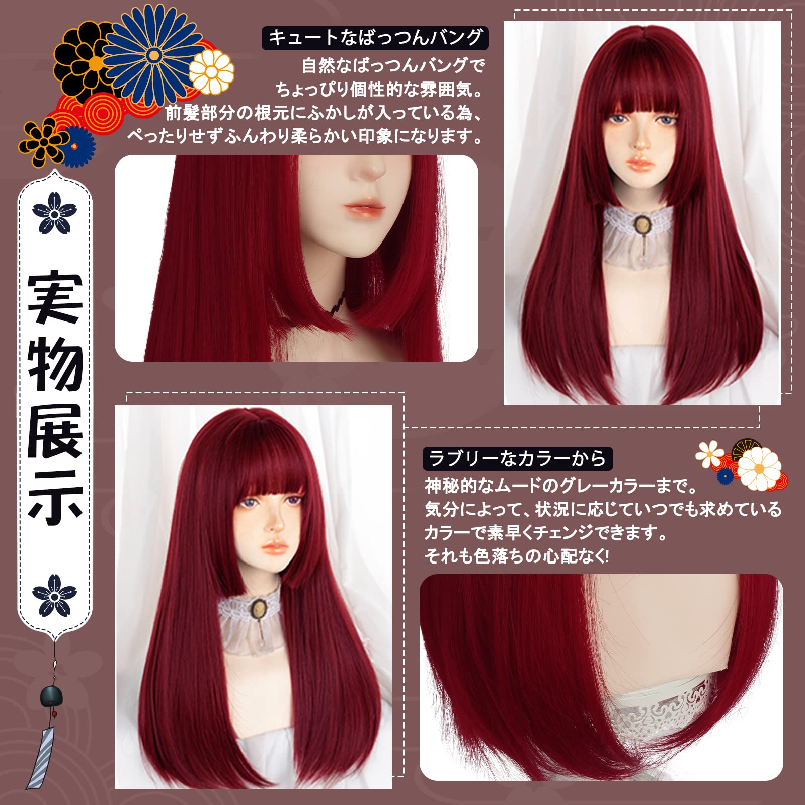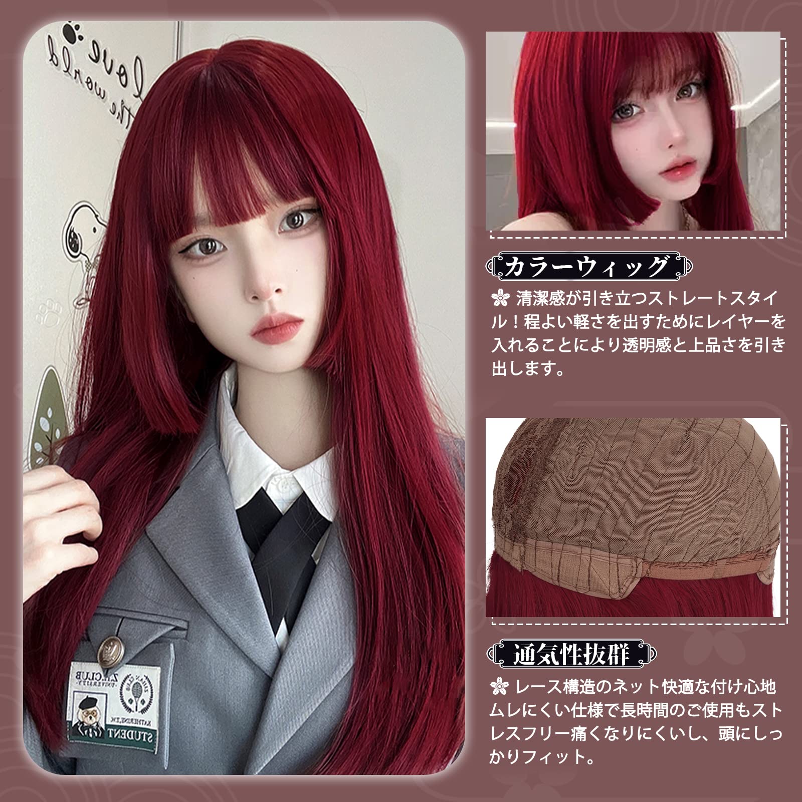 Hawkko ウィッグ ロング フルウィッグ ストレート 姫カット かつら インナーカラー グラデーション レディーズ カツラ ぱっつん 前髪 姫髪 wig 女装ウィッグ ハロウィン 小顔効果 原宿系 ロリータ ネット/櫛付き(マーメイドローズレッド) Free | Bloomia