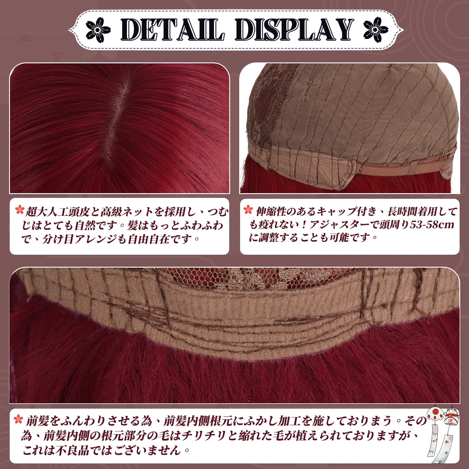 ②?商品情報:前髪:つむじから約13cm 後髪:つむじから約60cm 重さ:約220g。アジャスター付きなので、個々の頭の大きさに合わせて段階調節することができます。(つむじ部分から測った長さです。サイズは計りにより、1cm-3cm誤差が生じる場合がございます。)(ウィッグは後頭部の内側にサイズを調整できるアジャスターが着いています。頭周り53?58㎝に調整することも可能です。)