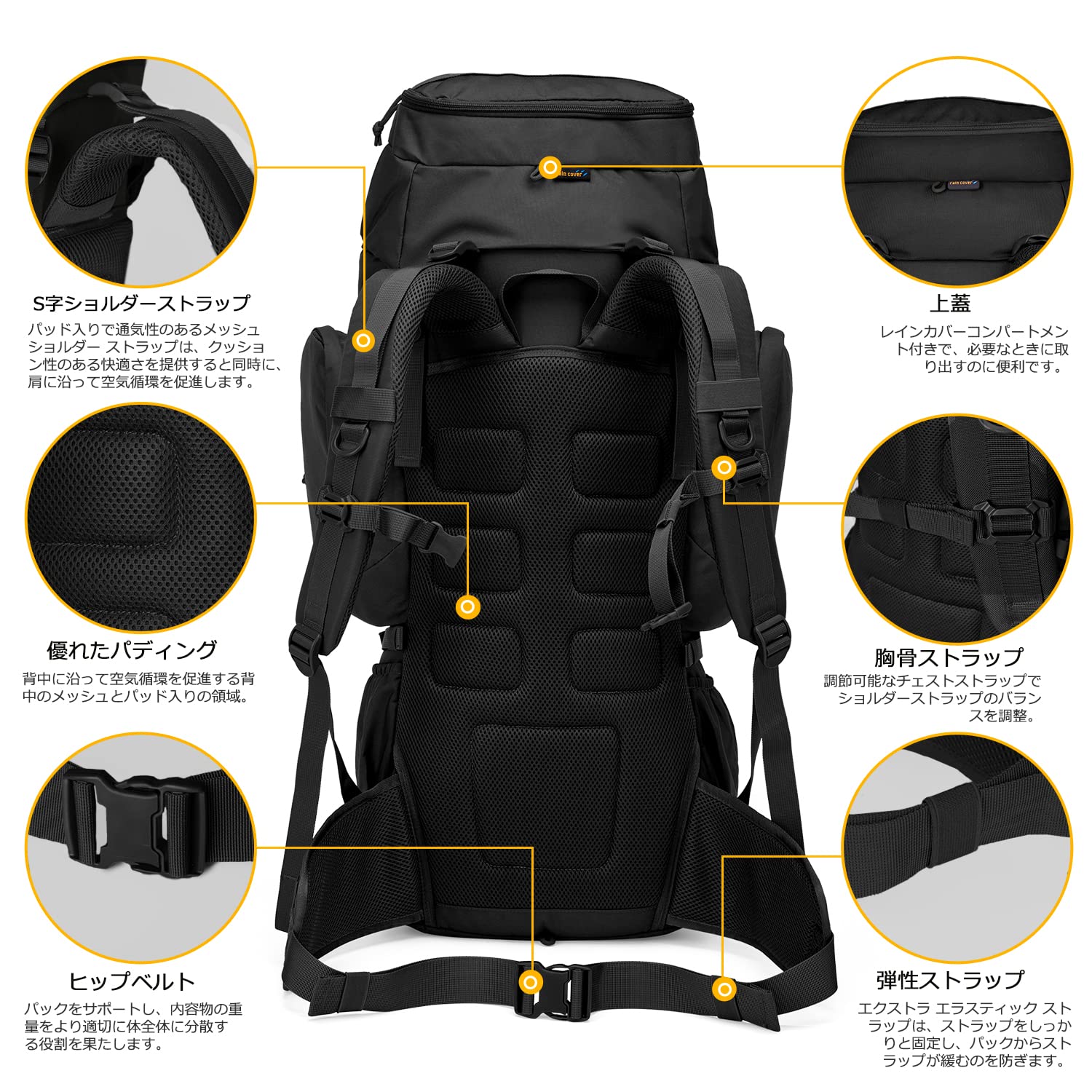 MOLLEモール対応なので、ドリンクホルダー、ゴーグル、カラビナ、望遠鏡などの小物が掛けることができる。拡張性が抜群である。上蓋にあるジッパーポーチでレインカバーが入っていて雨の日も安心します。