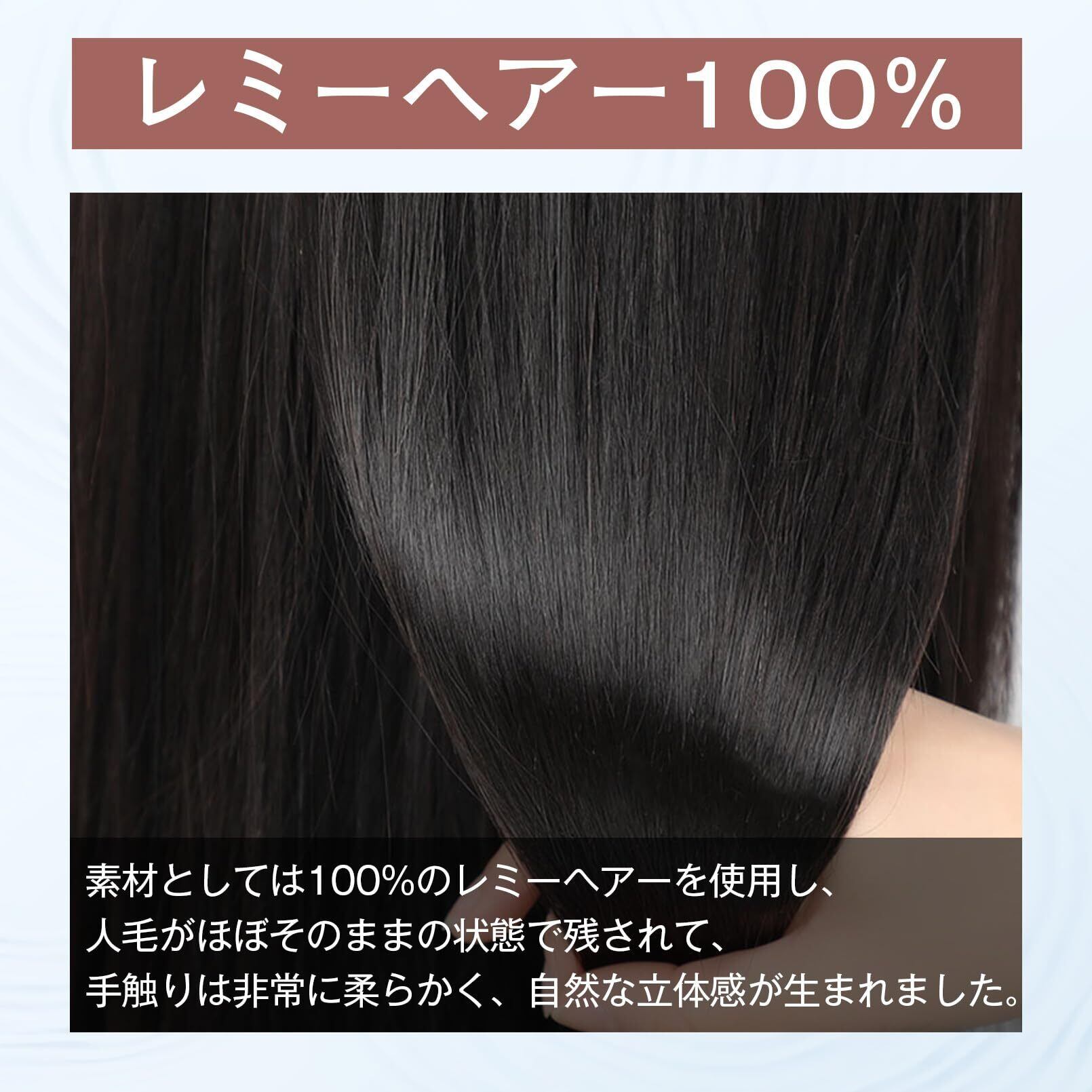 レミーヘアー100%:100%原髪で製造されています。レミーヘアーは、毛髪のキューティクルがほぼそのままの状態で残されている高級な人毛です。髪の毛が自然なまま使用されているため、その手触りは非常に柔らかく、自分の髪のように違和感がありません。頭皮にも優しい仕上がりとなっています。