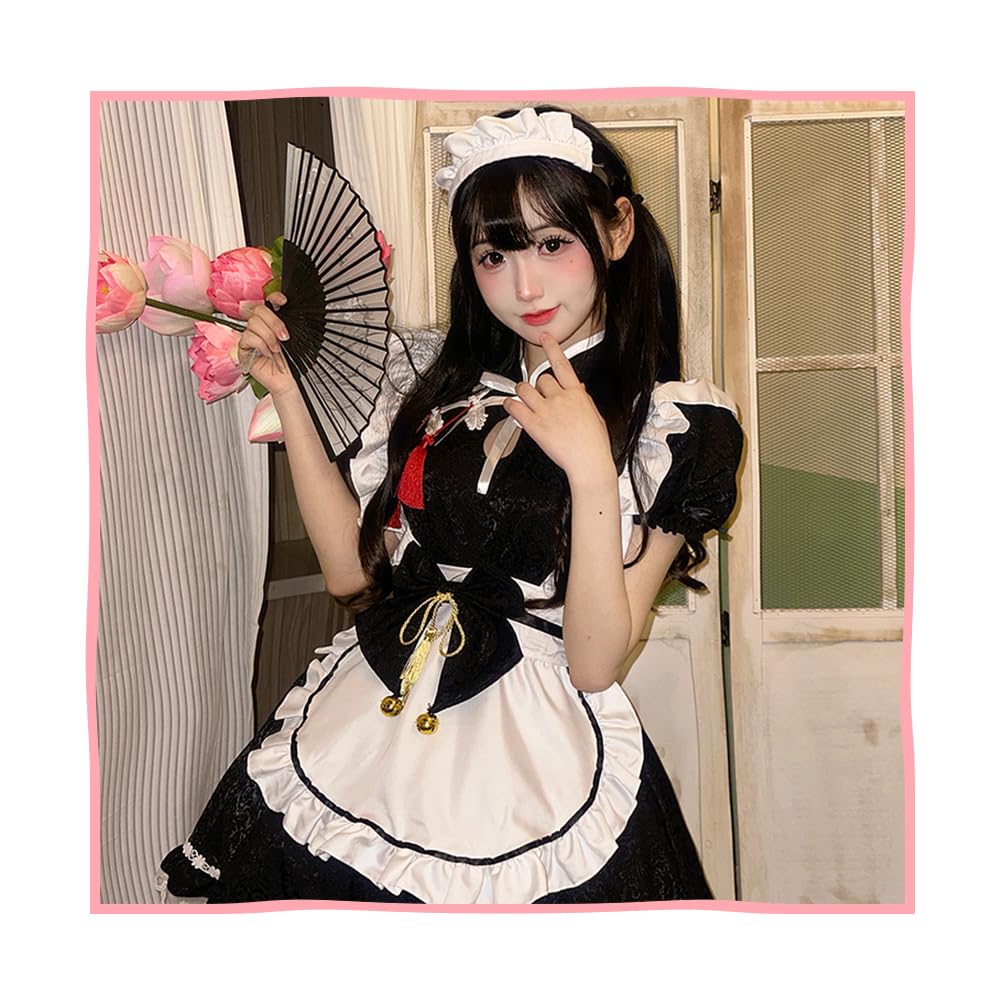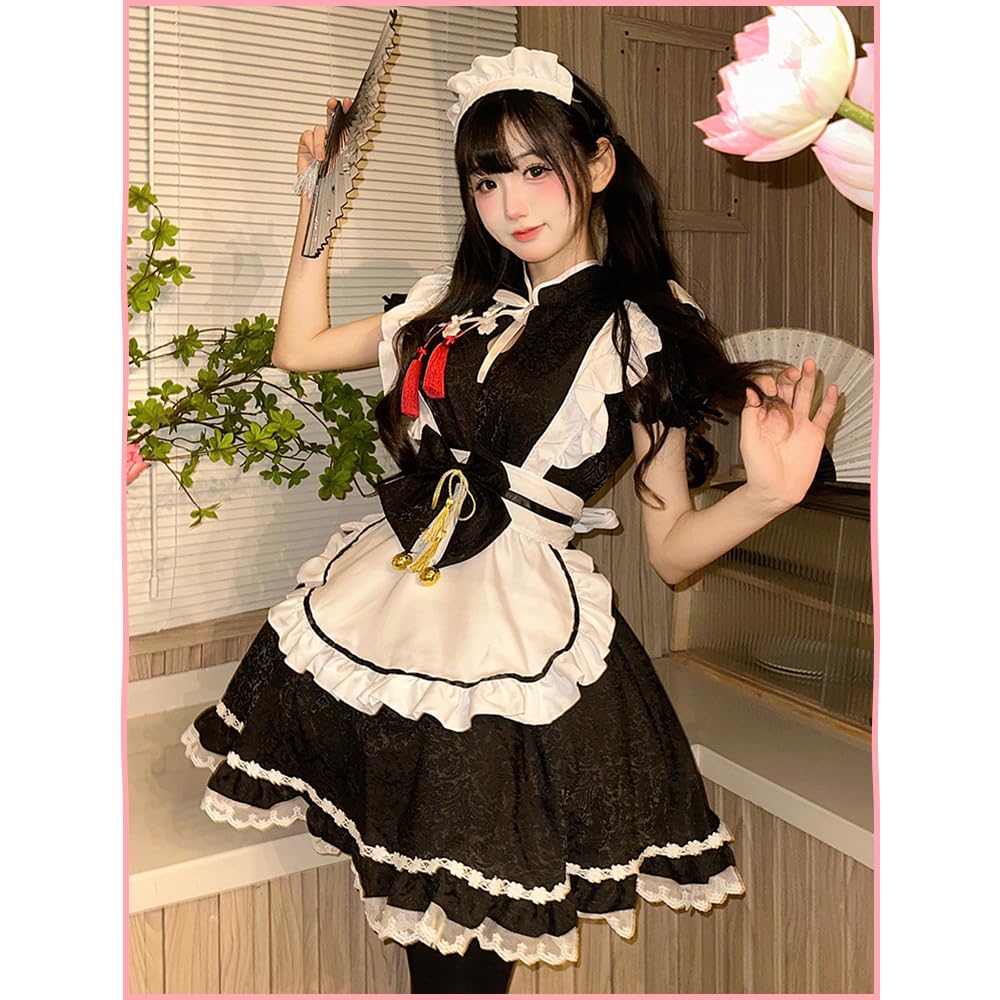 [RPFLQ] メイド服 コスプレ ハロウィン 仮装 ロリータ ロリ 蝶結ぶ 胸空き コスチューム レディース エプロン 衣装 長袖 半袖 フリル 可愛い 萌え 撮影 学園祭 イベント 活動 ヘアバンド ニーハイソックス付き | Bloomia