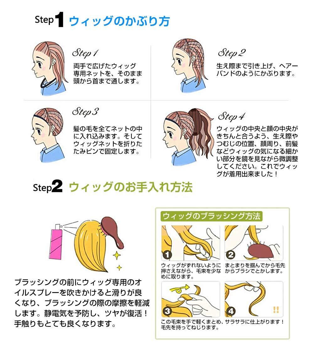 【ウィッグの情報】高級耐熱ファイバーを採用、今まで気になっていたウィッグ特有のテカリ感を抑え、より人毛に近づけたしっとりとした柔らかな手触り。耐熱160℃なので、コテ/ドライヤー/アイロンなどで好みの髪型に整えることができます。付属品:フルウィッグ専用ネット2個付き