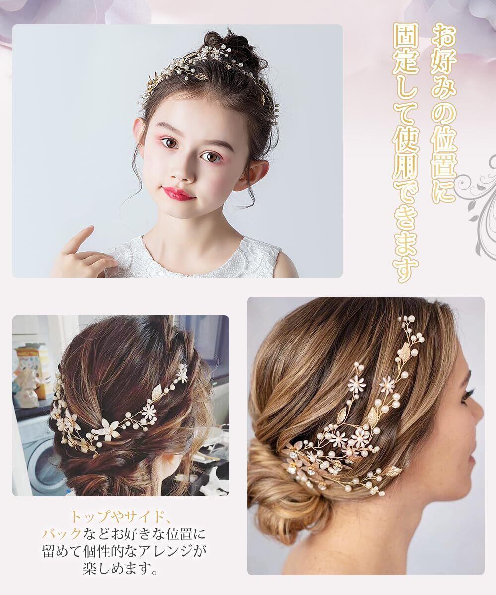 ユニークなデザイン:立体感のある花とリーフがエレガントなヘッドドレス。光沢感のあるゴールドとパールが優雅さを引き立てます。