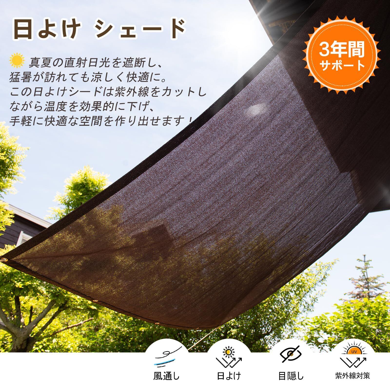 UV対策:通気性や遮光性に優れ、シェードの内側を涼しくします。有害な紫外線も90%カットするので、子供たちが遊ぶお庭や砂場の日よけに最適です。