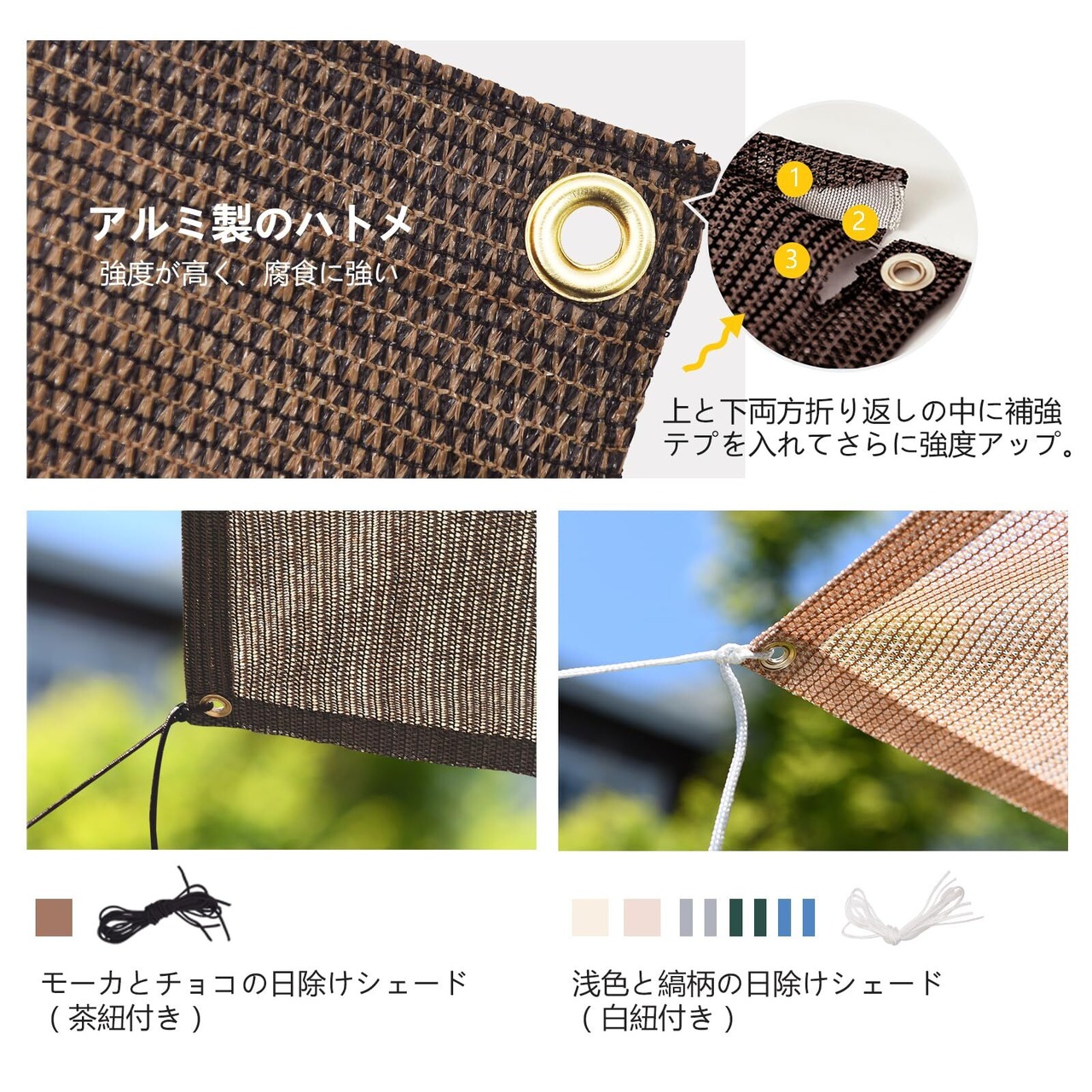取り付け:錆びないのゴールデンアルミハトメが付いているので、付属品:6本x1.5m取付けひも、ベランダや窓ペ、廊下、庭下、庭先、玄関などに簡単に取り付けることができます。お洒落なデザインなので、日よけだけでなく、ご自宅やお庭のエクステリアとしてもご利用なれます。