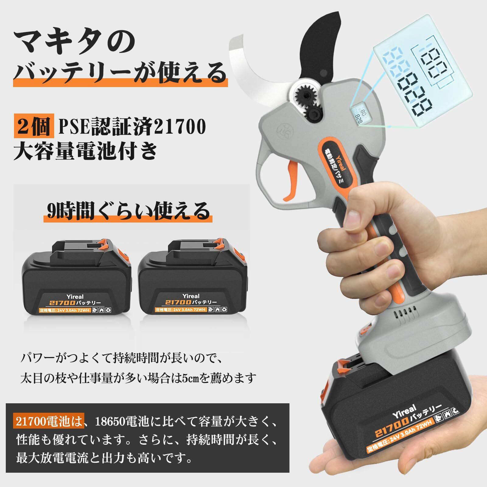 【PSE認証取得&マキタと互換】この充電式剪定は人間工学に基づき軽くて持ちやすいタイプです、女性や高齢者にも優しい軽量化を実現しており、ソフトグリップが握りやすいため、長時間使用しても腕に負担をかけることなく、時間と体力を節約できます。大容量バッテリーは6000mAh(3000mAh*2個)大容量なので連続的に9時間以上剪定できます。バッテリーは既にPSE認証取得済なのであんぜんにご使用できますし、マキタ18Vバッテリーと互換できるし、非常に便利です。