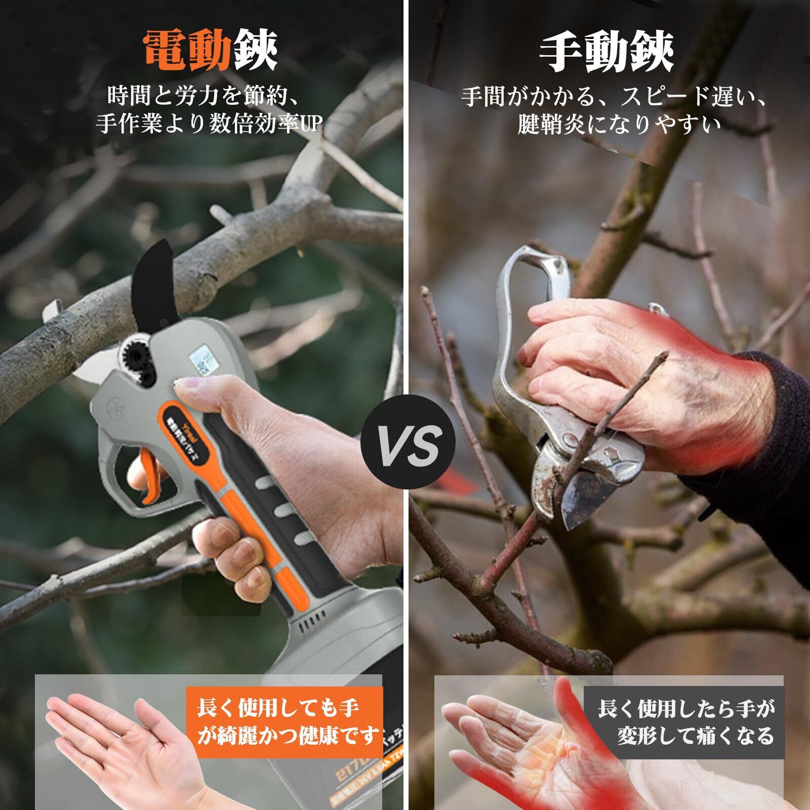 【安全保護&品質】事故を防ぐために電動剪定ばさみを作業する時に、トリガーを素早く2回連続引く必要があり、更に1分間ぐらいに作業していない場合はハサミが再起動する必要があり、そうしなければ刃が正常に動作しません、これらによる誤って切断するリスクを大幅に減ります。プロ監修なので実用性と品質に大切に持っています、商品を出荷する前に全数検品しました、お客様が楽しく長く使うように努力しております。