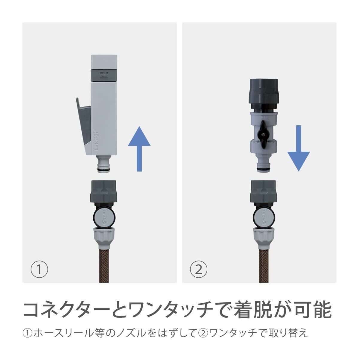 ホースリールと洗車ブラシや洗車スポンジの接続に便利なコック付きのコネクターです。切替コックで通水・止水の切り替えができます。タカギ製のコネクターとワンタッチで着脱が可能です。