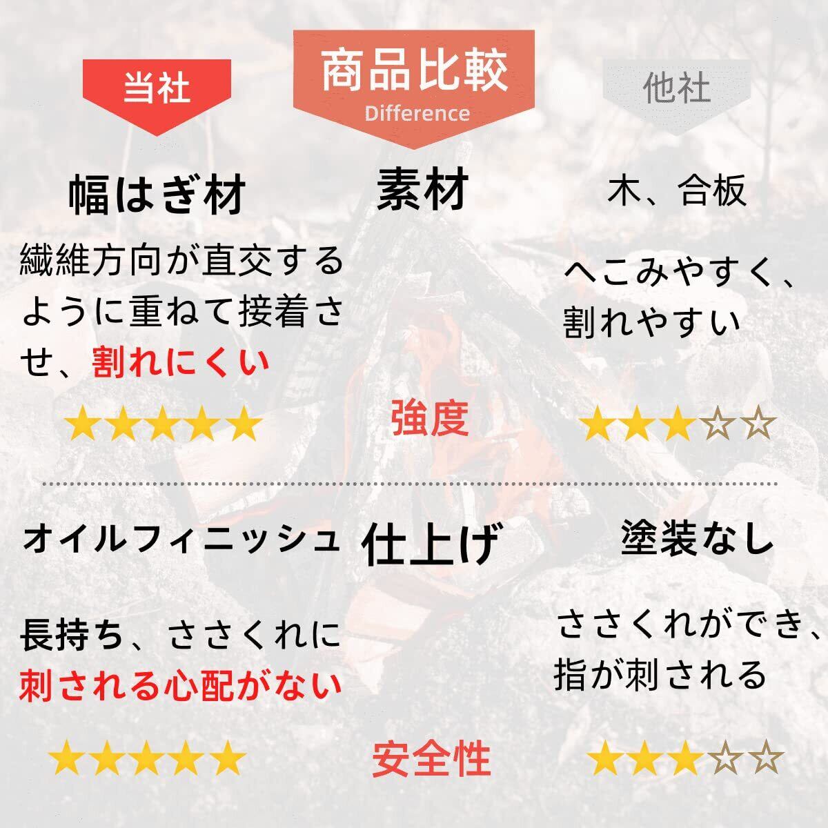 特徴(2)刺されない ササクレ・トゲをを取り除くため、研磨作業を始める前に、24時間、板にオイルを染みこませてから、やすり掛けします。角や表面がすべすべ状態を確認してから、2度にオイル塗りこみ、磨き、商品に仕上げます。 ササクレやトゲに刺されない、コンタクト薪割り台