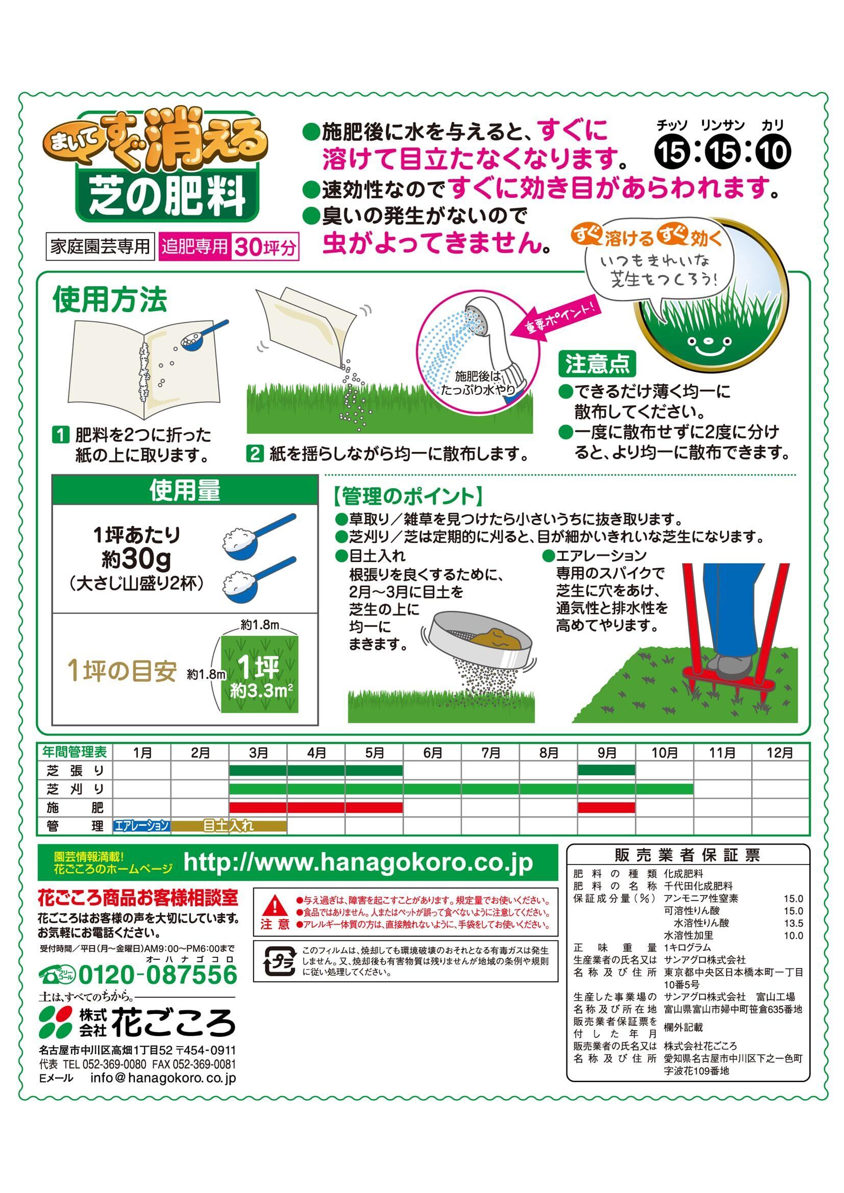 使用方法:1坪(約3.3平米)当り約30gを春と秋にまく