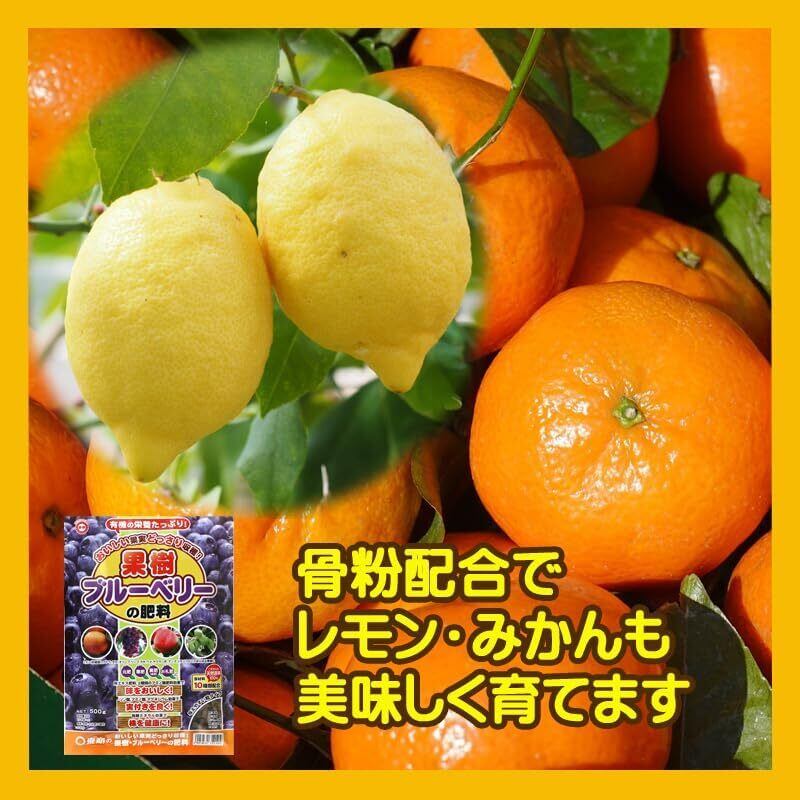 果樹やブルーベリーの根元に円を描くように肥料をまき、軽く土と混ぜ込んでください。春と秋の年2回に分けて施肥してください。