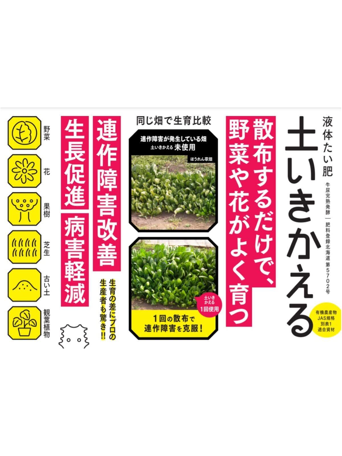 使用方法:広い面積の菜園・農業では作付前に1反(300坪)に対し「土いきかえる」を1.8Lを100Lの水で希釈(55倍)し、全体に散布してください。作付け後は1反(300坪)に対し「土いきかえる」0.4Lを100Lの水で希釈(250倍)し、葉面から散布を2-4回行ってください。作付け前に散布できなかった場合でも効果が期待できます。