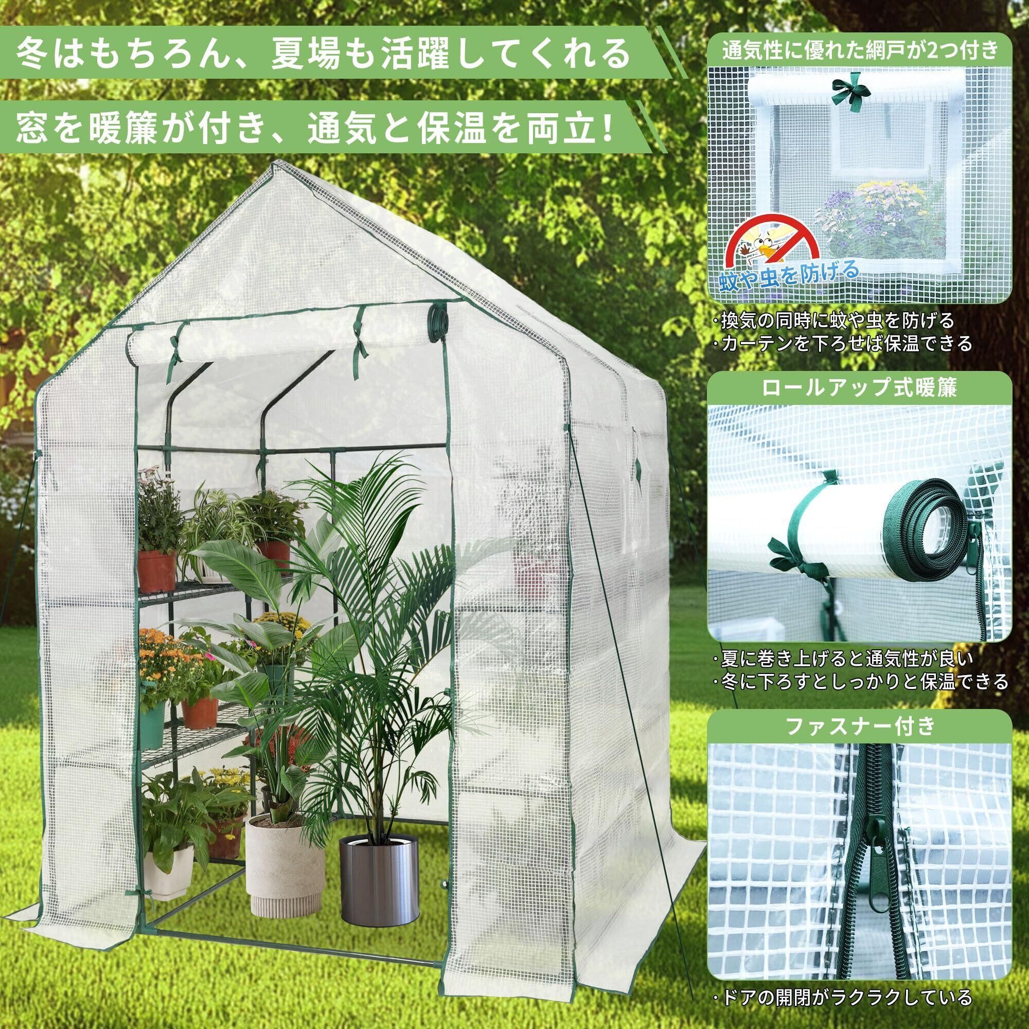 【通気と保温を両立させるドア付き】ドアはジッパー付きのロールアップ式で、開閉がラクラクしていて、作業に便利です。冬に窓とドアを下ろすとしっかりと保温できます。夏に巻き上げると通気性が良くて、便利なアクセスとシールドされた換気を提供し、最適な空気循環を実現します。冬はもちろん、夏場も活躍してくれます。