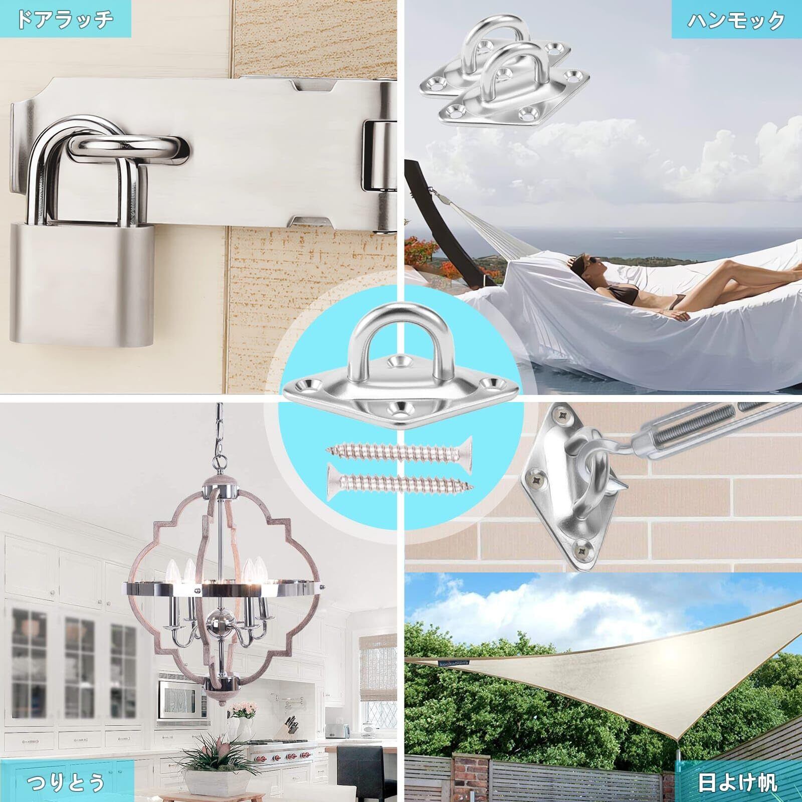 【応用】:ハンモック、サンシェード、ドアラッチ、ガレージ、タープ、空中ヨガ、ロッカーフック、引き出しフック、マリンボート、外壁用金具。ワイヤー、ロープ、チェーンの端末金具として。