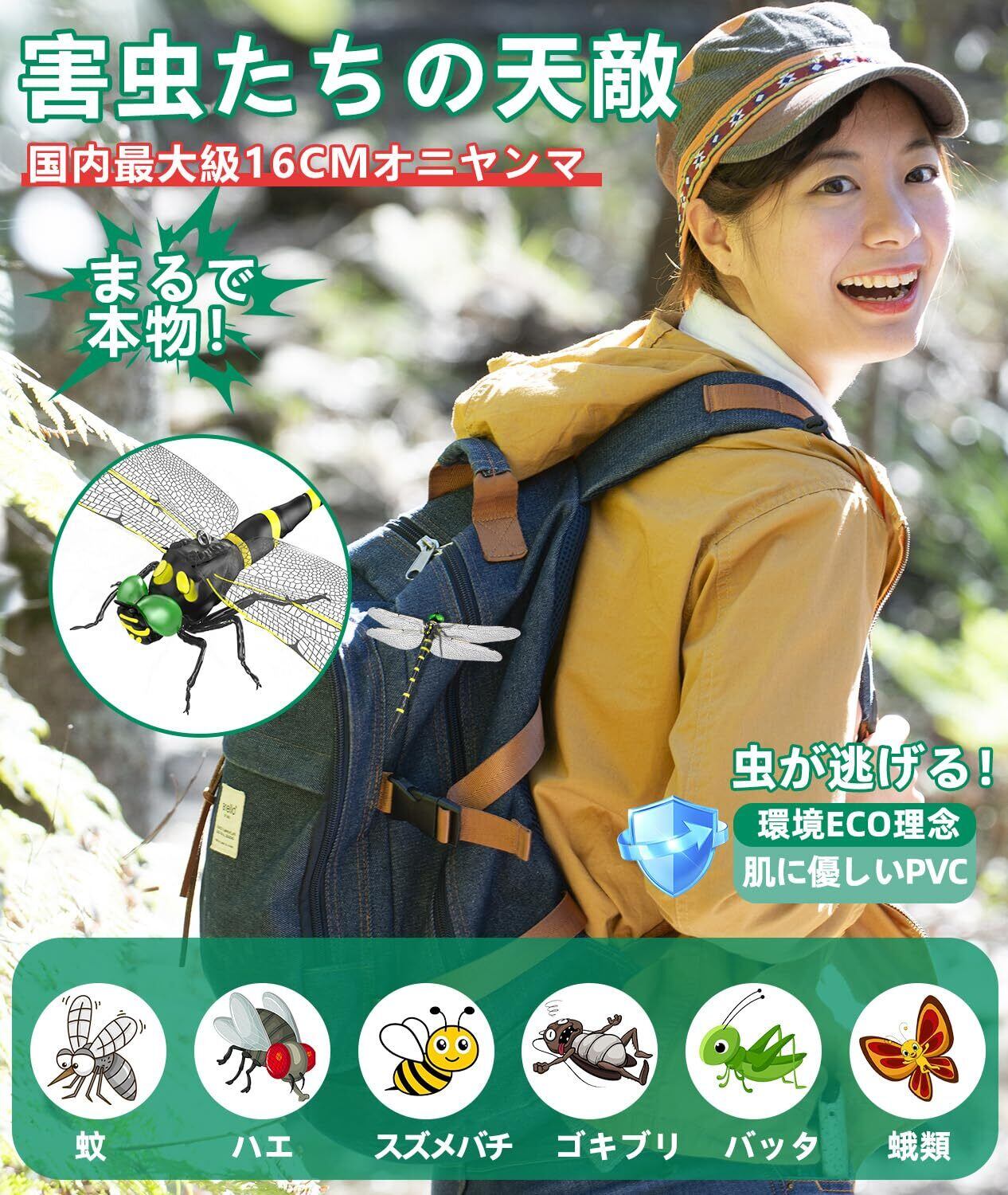 2025年新型「市販最大 オニヤンマ16センチ」虫除けとんぼ リアル 虫除け対策 肉食トンボ 耐久性PVC素材 安全ピン付きストラップ付き 釣り 室内装飾 ベランダ 網戸 室内 登山 渓流釣り キャンプ アウトドアに対応 (16cm-4匹)