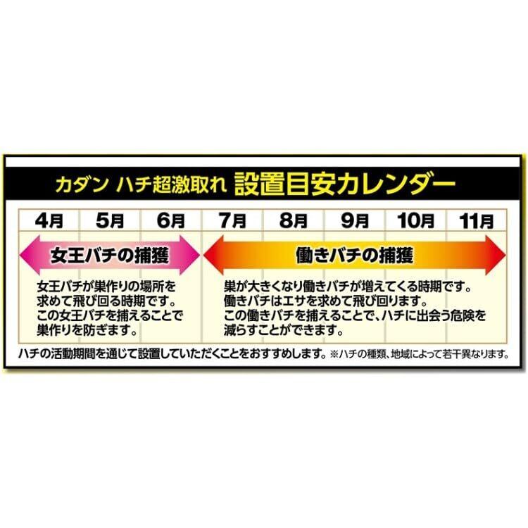 スズメバチも捕獲!女王バチも退治&巣作り予防!ハチが好む樹液を再現。 ●吊るした日から強力誘引 人工樹液に乾燥酵母を加えた独自ブレンドの誘引捕獲液でハチを強力に誘引します。 ●一度入ったら出られない 容器に落下したハチに誘引捕獲液が密着し、溺れさせて捕獲。一度入ったら出にくいスリ鉢構造の容器で逃がしません。 ●巣作り予防にも 春先に活動する女王バチを捕獲すれば、巣作りも防げます。 ●持続期間約1ヵ月 ●スズメバチを逃がさない ●容器形状を一新 新形状の屋根の採用により、組み立てが簡単になりました。さらにプラスチック使用量は約20%削減※、環境にも配慮しています。 ※当社従来品比 ●使い捨てタイプ